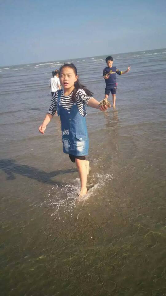 接着,我们来到了大海边,这是一个美丽如画的地方,大海一望无际,金色的沙滩像太阳一样耀眼,看着大海我的心胸立刻变得开阔起来,使我神清气爽、心旷神怡。我和几个小伙伴在沙滩上奔跑、玩耍、捡贝壳、捡海星……。玩得别提有多开心了!