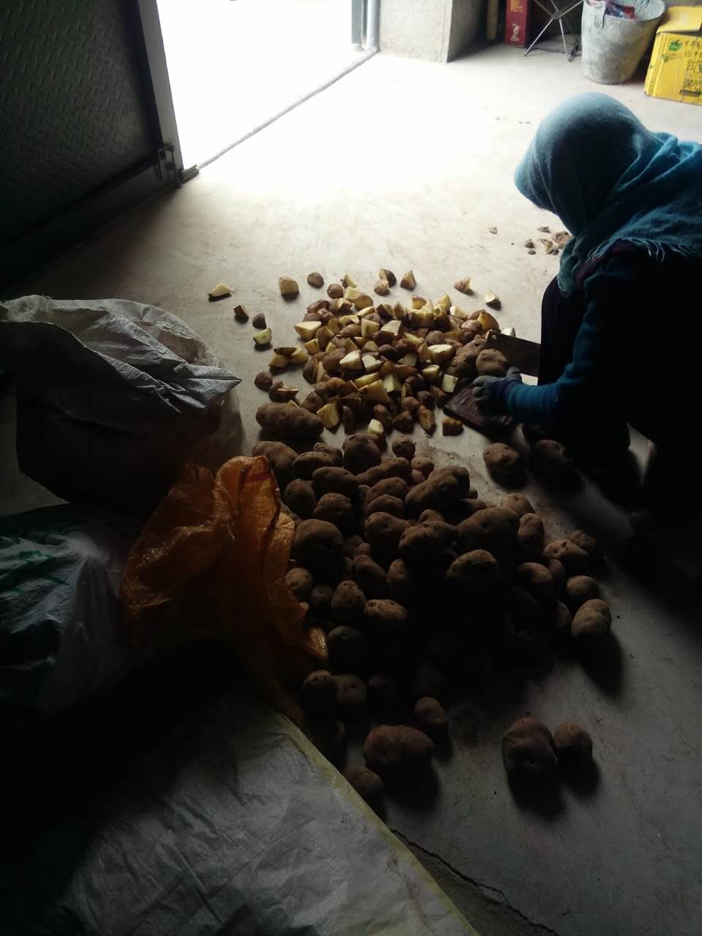 首先要把土豆切成块状。这切土豆可不只是单纯的把土豆切成块,而是有讲究的。切土豆时要避开芽眼切,而且还要顺着土豆的走向切。如果把土豆的芽眼切开了,那它就不会发芽了。奶奶拿起菜刀,支起木板,熟练地切着土豆。一下午的时间就把窖里用来当种子的土豆切完了。