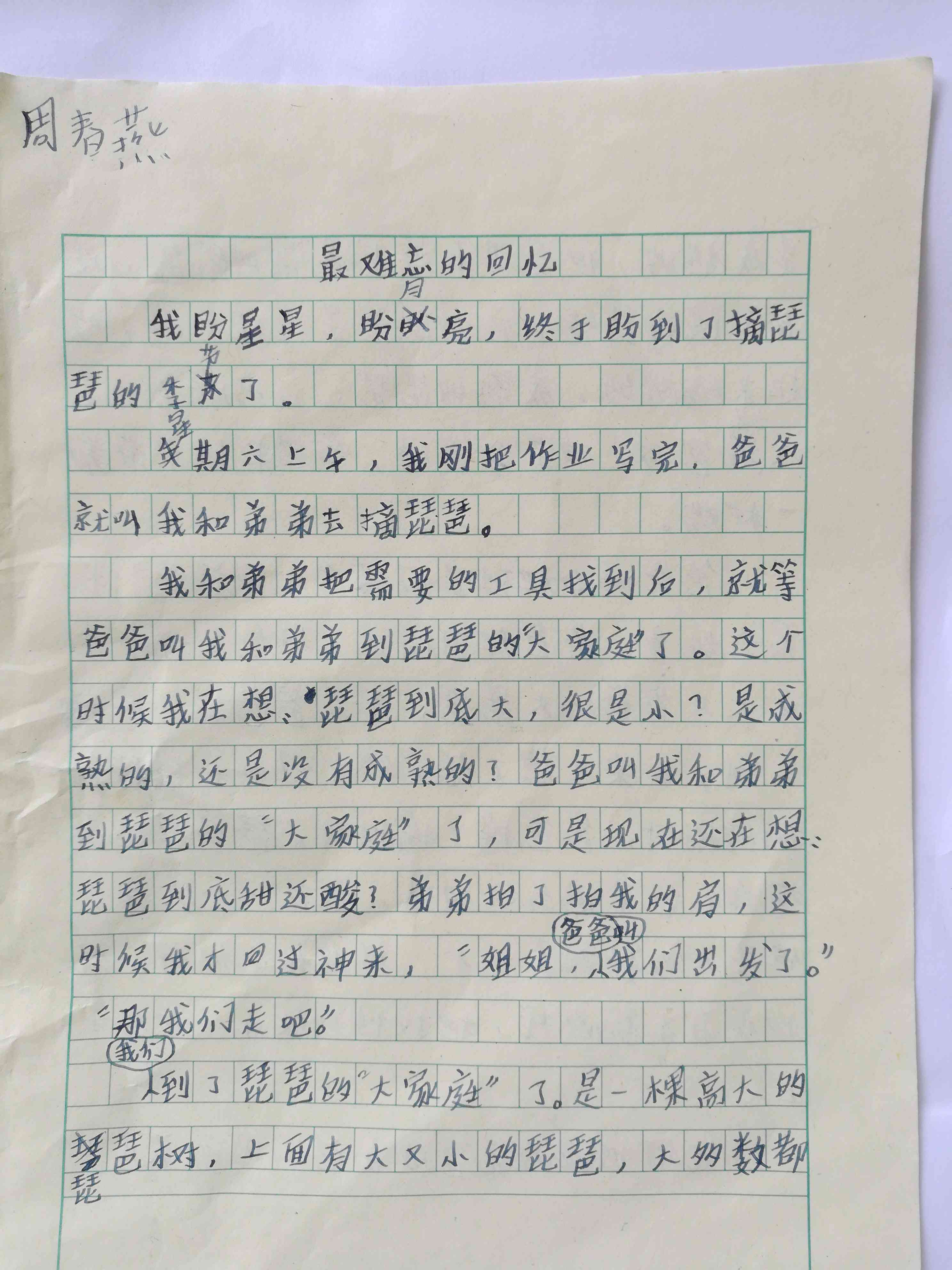星期六上午,我刚把家庭作业写完,爸爸就叫我和弟弟去摘琵琶。