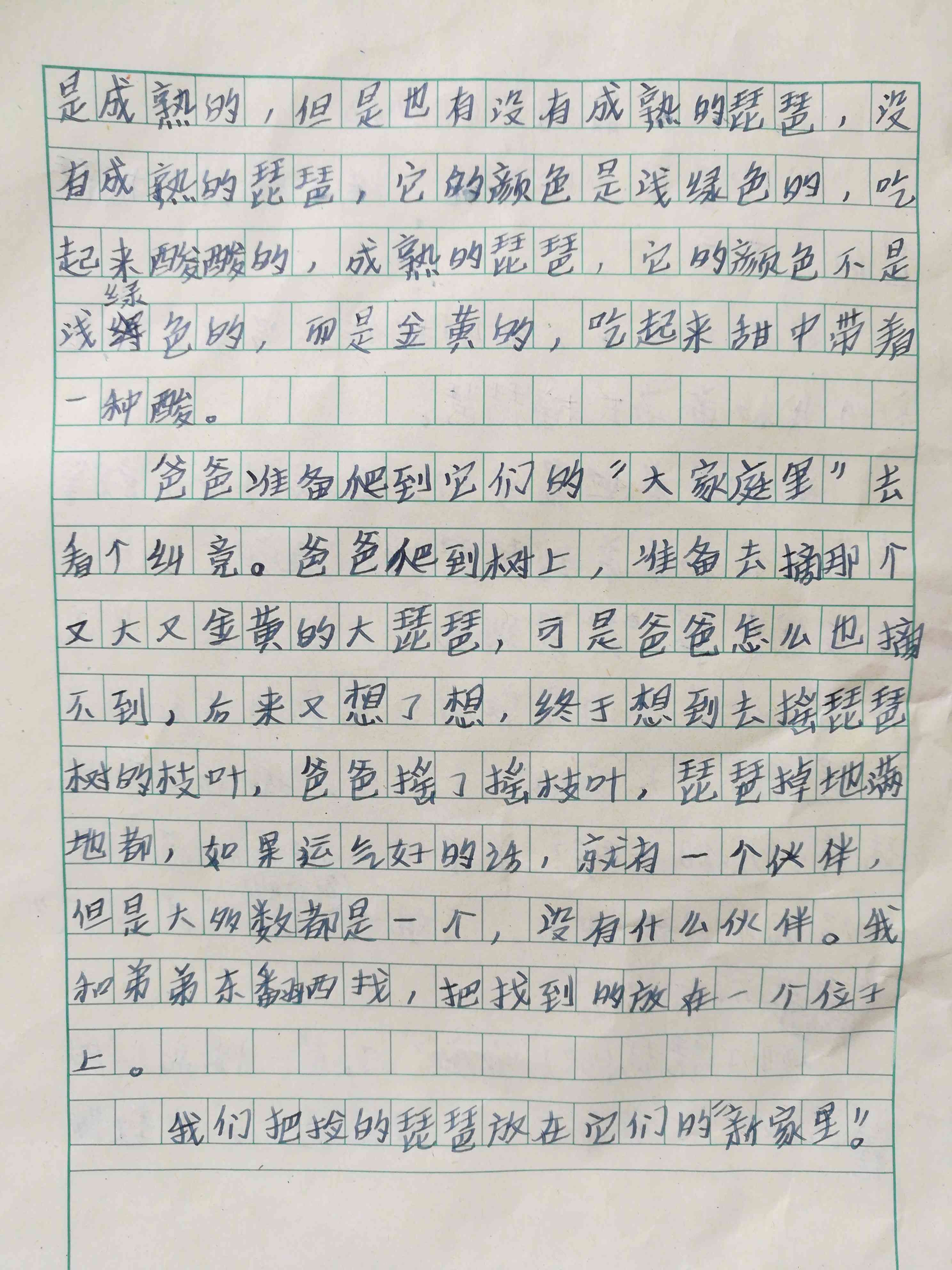 我们到了琵琶的"大家庭"了。是一棵高大又挺直的琵琶树,上面有大的琵琶,也有小的琵琶,大多数都是成熟的琵琶,但是有未成熟的琵琶,没有成熟的琵琶,它的颜色是浅绿色的,味道吃起来酸酸的,成熟的琵琶,它的味道和浅绿色的琵琶的味道不同,成熟的琵琶的味道吃起来甜中带着一种酸。爸爸准备爬到它们"大家庭"里,让它们从"大家庭"里下去,到陆地来。爸爸爬到树上,准备去摘那个又大又金黄的大琵琶,可是爸爸怎么也摘不到,后来又想了想,终于想到去摇琵琶树的枝干,爸爸摇了摇琵琶树,琵琶掉地满地都是,如果运气好的话,就有一个要好的伙伴,但是大多数都是一个,没有什么伙伴。我和弟弟东翻西找,把找到的放在一个位子上。