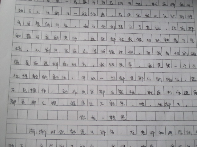 "沿着校园熟悉的小路,清晨来到树下读书,初升的太阳照在脸上,也照着身旁这颗小树……"又是这熟悉的旋律,又是这熟悉的场景,但人却已不是那群人了。重新怀着满心的憧憬与希望,来到了这所初中。刚迈进学校的大门,映入眼帘的便是孔子像了,是孔圣人呀,不禁让我心生敬仰,于是我的心里便暗下决定,在这个新的环境里,做个全新的自己,努力,发奋,会有一片属于你的天地。就这样我开始了人生的又一段旅途。在这里我又认识我许多可爱的同学们,我与他们又建立了友谊,还有那和蔼可亲的老师,这些都让我很快的熟悉了学校。从前只是在小学听说过你,我与你的相遇是在这里。我很荣幸,我是第一个与你接触的新生,开始一切都是那么的陌生,还不会操作,动作也是那么笨拙,就连打字速度都是那么慢,程序也不熟悉,哎,忧郁了。你我.熟悉