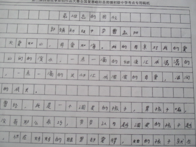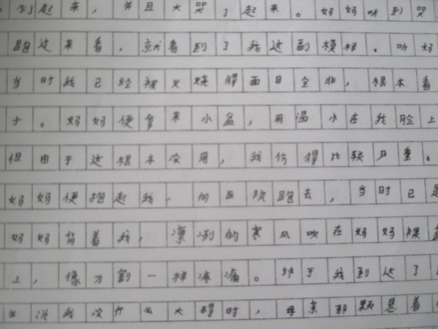 曾经,我是一个调皮的孩子,男孩子嘛,肯定没有那么乖巧,爷爷认为越调皮的孩子越聪明,但在妈妈的眼里却觉得,她的孩子就应该听话,乖巧,成绩还要优秀,但我呢在学校里经常捣蛋,遭到老师的批评,在家里也经常不听家人的话。妈妈对此就比较生气,总是对我要求那么严格,那时侯,我还不懂那是对我的另一种爱,总以为妈妈不爱我,我对她一直有些偏见。这样的看法一直持续到小学四五年级,知道那件事情之后,我才彻底的改变了看法。那天晚上,我正和妈妈坐在沙发上看电视,我看到电视里面那些人在墙上飞檐走壁,就想学习他们,结果,一不小心就掉进了面前的火盆里面。顿时我感到脸上一生钻心的疼痛,我下意识地跳了起来,并且大哭了起来。妈妈听到哭声,赶紧跑过来看,就看到了我这副模样。听妈妈说,当时我已经被火烧得面目全非,根本看不出样子。妈妈下意识的拿来水盆,用温水在我脸上擦拭。但这根本没有用因为我伤的比较严重。于是,妈妈便抱起我,向医院跑去,当时已是寒冬,妈妈背着我,凛冽的寒风吹在妈妈裸露的皮肤上,想刀割一样疼痛。终于我们到达了医院。当医生说我没事的时候母亲那颗悬着的心才落地了。事后,我问母亲,她累吗,母亲却说,她当时只想着我我没事就好。回到家中,母亲每日都重复着同样的工作,为我涂药换药。经过母亲的精心治疗,我终于康复了。自从经历了这件事后,我才知道明白了母亲的用意,原来母亲一直都是爱着我的,可是我没有发现。现在回想起来,那时的我是多么的不懂母亲对我的爱。现在,我将把这份爱永远的珍藏起来,一直放在我的心中。这蕴藏着一个母亲,对儿子深沉的爱。妈妈就如同是我成长路上的那盏引路灯,照亮我前行的道路。渐渐的我长大了,上了初中,我明白了您对我的良苦用心,知道那是您对我要求严格都是对我好,您是希望我有一个好的前程。现在努力还不晚吧,我的心里暗下决定,在这里,努力学习。初一时,我的成绩只能算是可以吧,比起第一名还要差一些,有点郁闷,这时妈妈告诉我,不要急于求成,凡事要有耐心,坚持下去,就会有收获。听了您的话,我又充满了信心。初二是初中最关键的一年,我更加努力了,我的成绩也在一点点进步。这还要归功于妈妈,周末作业,妈妈总会陪我一起完成,无论做到多晚,妈妈总会在我的身边陪着我,直到我做完。妈妈虽然没有学过那么多的知识,但是她总会告诉我许多学习上的道理,有不懂的问题要多问老师,上课要认真听讲,作业认真完成等等,这些的激励着我。时间过的真快,初三了,作业负担是那么重,周周要考试,睡得晚,但大早上还要早起读书,每天都睡不好觉。妈妈知道我的辛苦,周末回家总会为我准备一桌好菜,早上也可以睡一会儿懒觉。妈妈说,她虽然不能辅导我的功课,但是可以让我的周末生活过的好些。妈妈总会变着花样给我准备各式各样的饭菜,每周回家都会有惊喜。几周过去了,发现自己好像又长了些肉。妈妈就是这样不辞辛劳,默默的为我付出着。愿时间再慢一些,陪伴再久一些。时间可以改变一切,但这份回忆却永远不会被抹去。