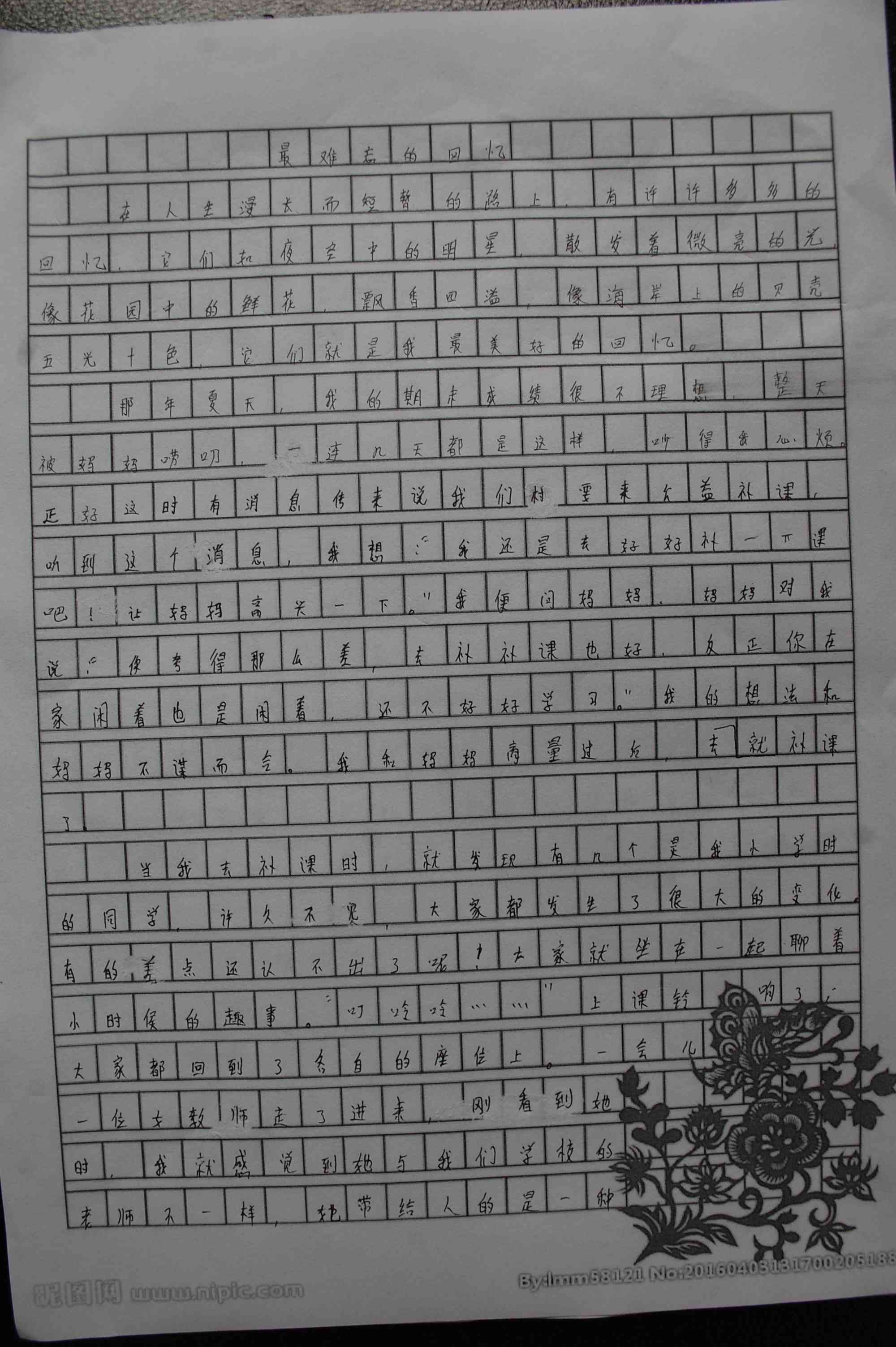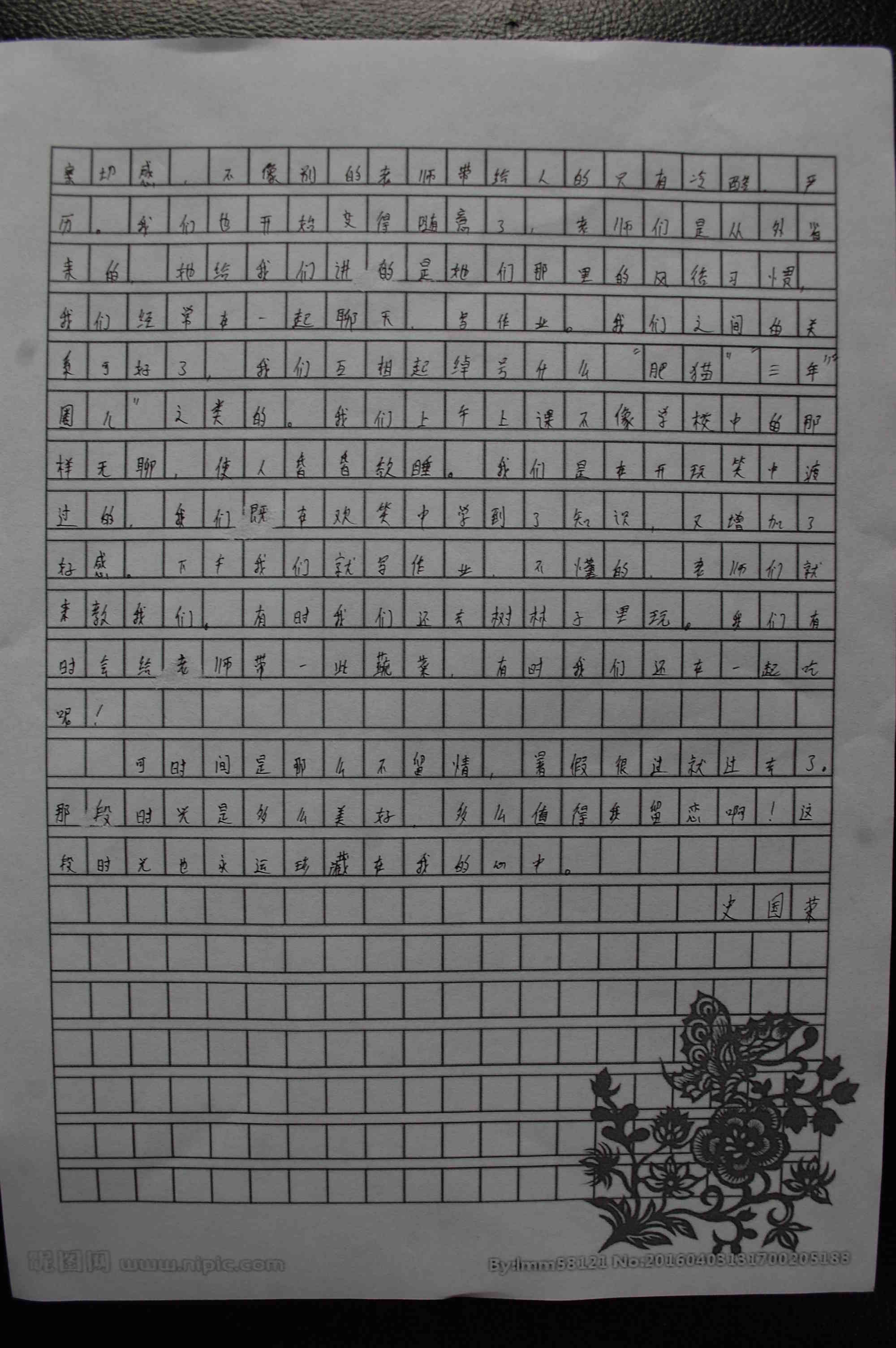 在我补课时,就发现有几个是我小学时的同学。许久不见,大家都发生了很大变化。有的差点还认不出了呢!大家就坐在一起聊着小时候的趣事。"叮铃铃......"上课铃响了,大家都回到了各自的座位上。一会儿一位女教师走了进来,刚看到她时,我就觉得她与我们学校的老师不一样,她带给人的是一种亲切感,不像别的老师带给人的是冷酷、严厉。我们也开始变得随意了。老师是从外省来的,她给我们讲的是她们那里的风俗习惯。我们经常在一起聊天、写作业。我们之间的关系可好了,我们互相起绰号,什么"肥猫"三年"圈儿"之类的。我们上午上课,不像学校中那样无聊,让人昏昏欲睡。我们是在开玩笑中度过的。我们既在欢笑中学得了知识,又增加了情感。下午我们就写作业,不懂的,老师就来教我们。有时我们还去树林里玩。我们有时会给老师带一些蔬菜,有时我们还在一起吃呢!