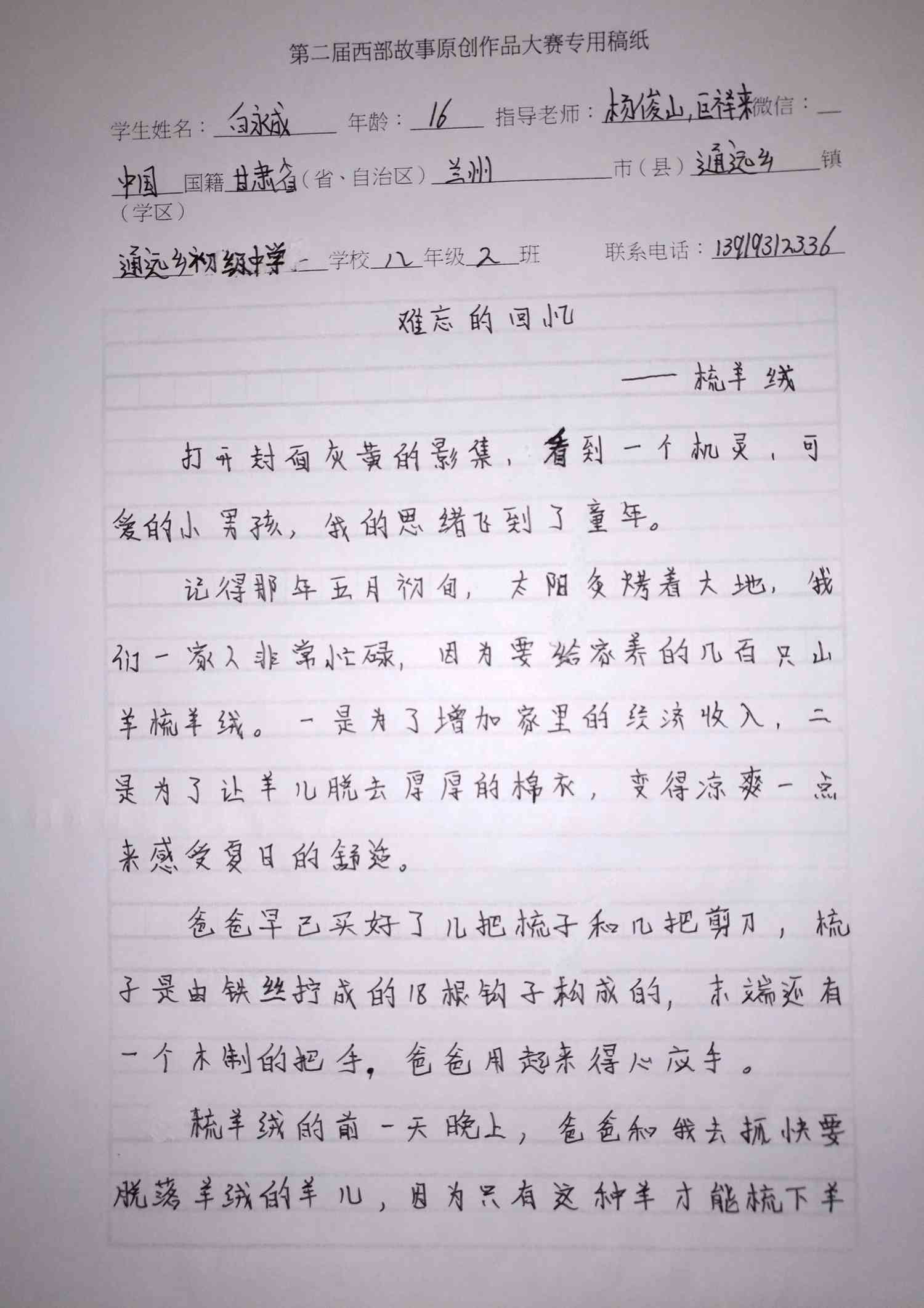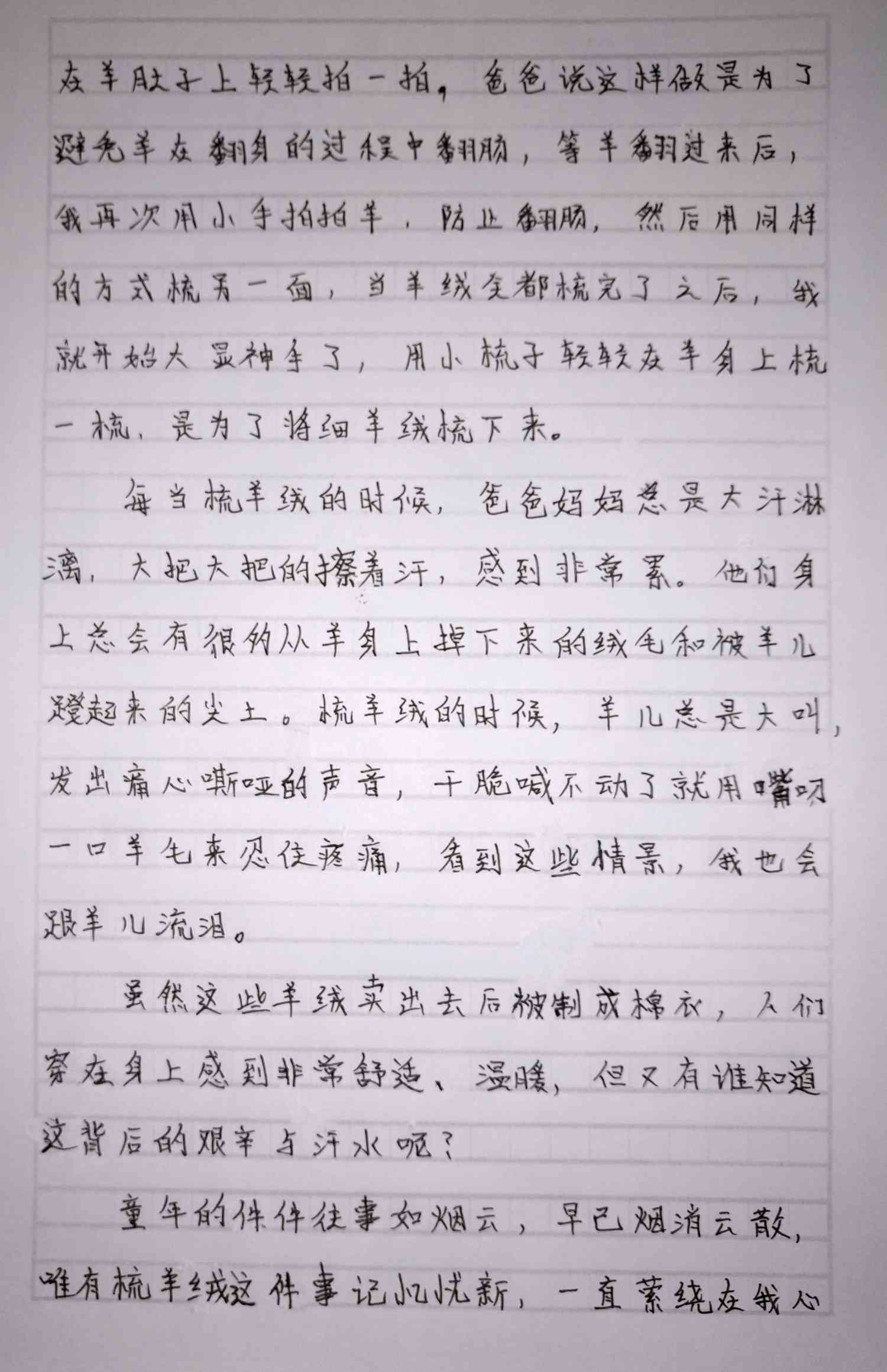 童年的件件往事如烟云,早已烟消云散,唯有梳羊毛这件事让我记忆犹新,一直萦绕在我的心头。可爱的羊儿,请你放心,等我长大了,一定会研发出一种新型的机器,不让你再受皮肉之苦了。