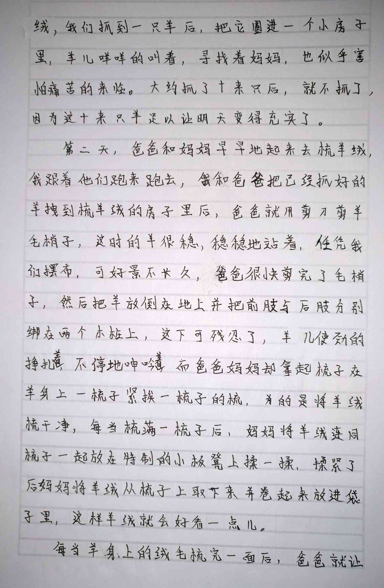 第二天,爸爸和妈妈早早地起来去梳羊绒,我跟着他们跑来跑去,我和爸爸把已经抓好的羊拽到梳羊绒的房子里后,爸爸就用剪刀剪羊毛梢子,这是的羊很稳,稳稳地站着任凭我们摆布,可好景不长久,爸爸很快剪完了毛梢子,然后把羊放倒在地上并把前肢与后肢分别绑在两个木桩上,这可残忍了,羊儿使劲地挣扎着,不停地呻吟着,而爸爸妈妈却拿起梳子在羊身上一梳子紧挨一梳子地梳,为的是将羊绒梳干净,每当梳满一梳子后,妈妈将羊绒连同梳子一起放在特质的小板凳上揉一揉,揉紧了后妈妈将羊绒从梳子上取下来并卷起来放进袋子里,这样羊绒就会好看一点儿。