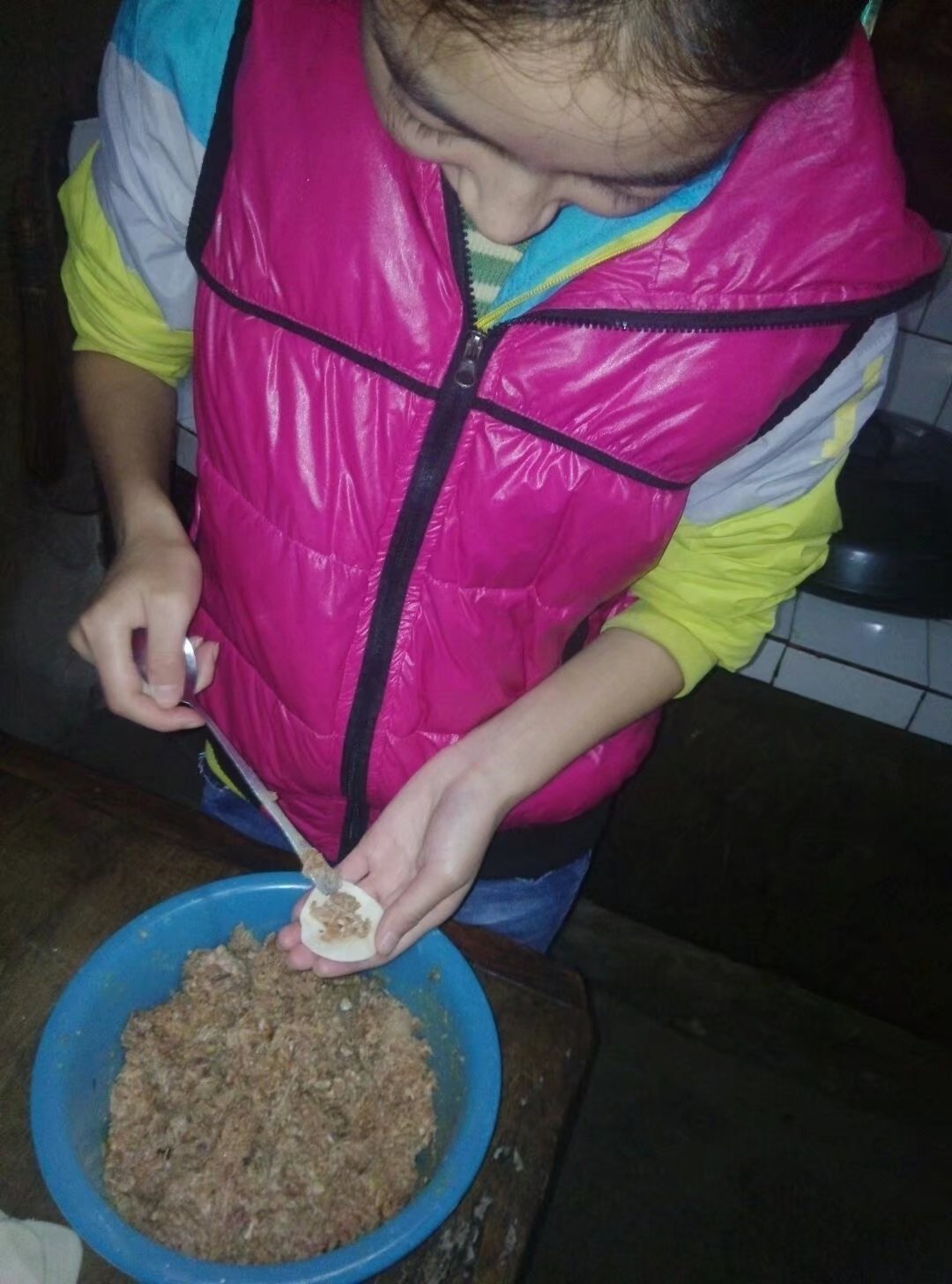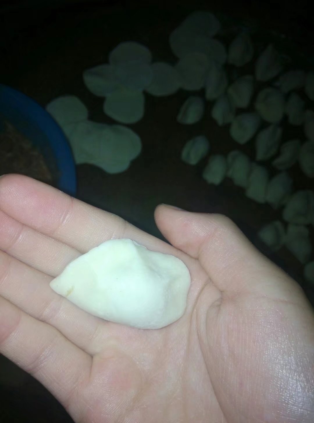 母亲给我擀了张面皮,我照着母亲的样子,先用右手拿住面皮,把面皮放在四个手指中间,然后稍稍弯曲。母亲给我盛了一勺馅儿放到了面皮的正中央,然后拿正了,接着就慢慢向一边捏,让面皮形成一个"水沟"状,接下来两手齐用,用力的将面皮往一起捏,直到饺子鼓起来为止。哈哈!第一个饺子成形了,可由于是第一次包,饺子的卖相不好看。