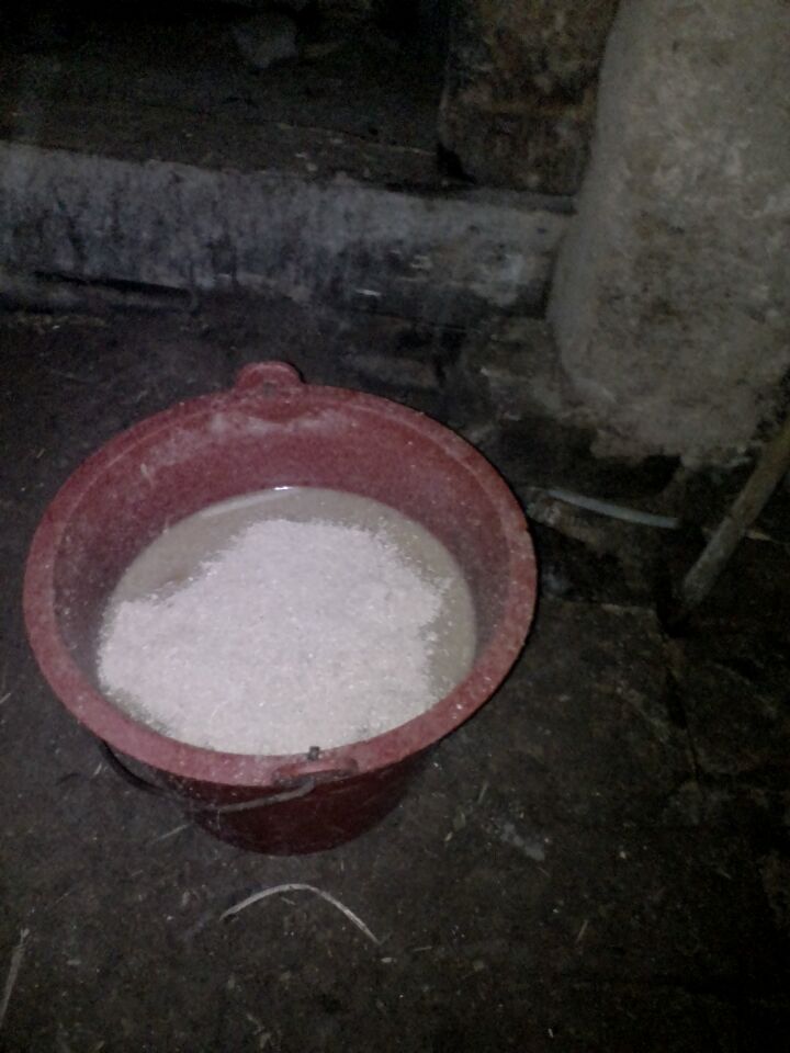 我拎来小塑料桶,把早上剩下的稀饭倒进了桶里,我舀了几勺麦皮倒进了桶里,然后我找来了一根棍子把饲料搅拌均匀,最后拎着桶向猪圈走去了。