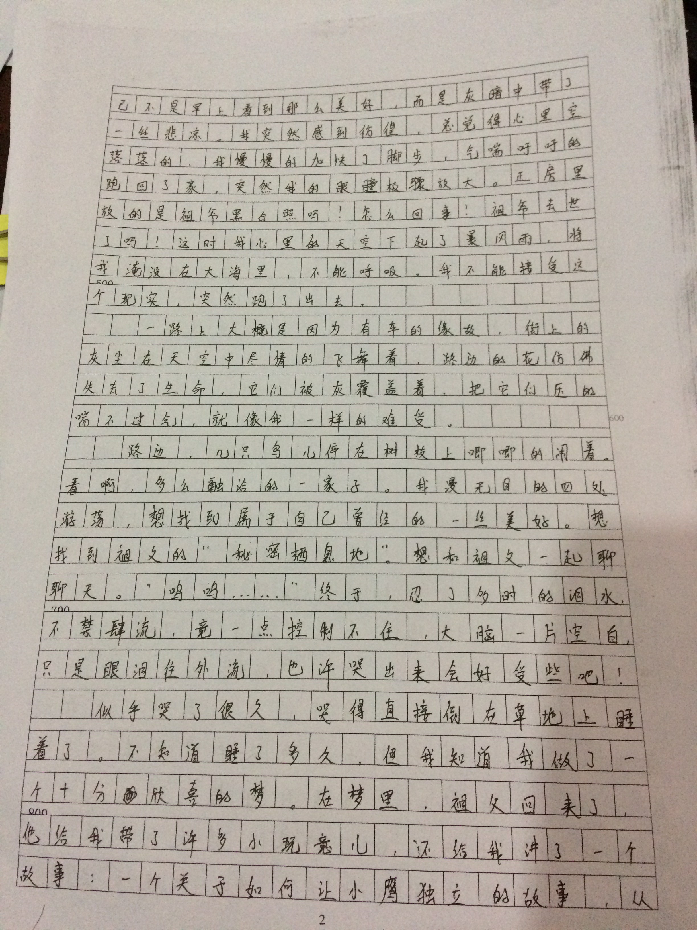 路边,几只鸟儿停在树枝上唧唧的闹着。看啊,相融洽的一家子啊。我漫无目的的四处游荡,想找到属于自己曾经的一丝美好。想找到祖父的"秘密栖息地",想在和他一起聊聊天。"呜呜。…"终于,忍了多时的泪水,不禁肆流,竟一点控制不住,大脑一片空白,只是眼泪往外流,也许哭出来会好受些吧!