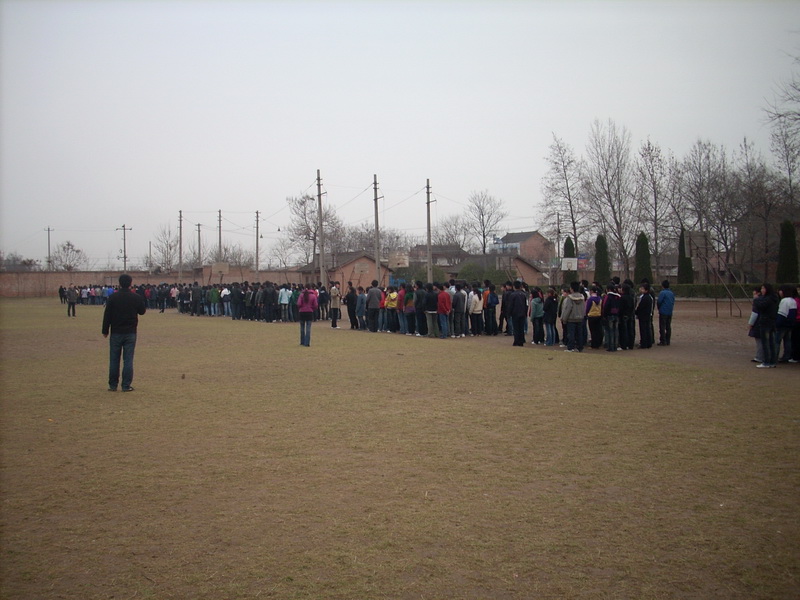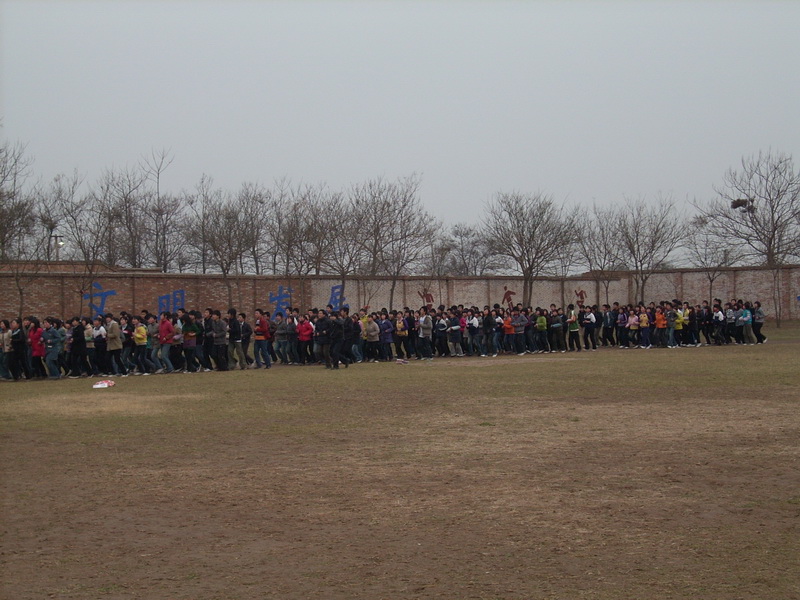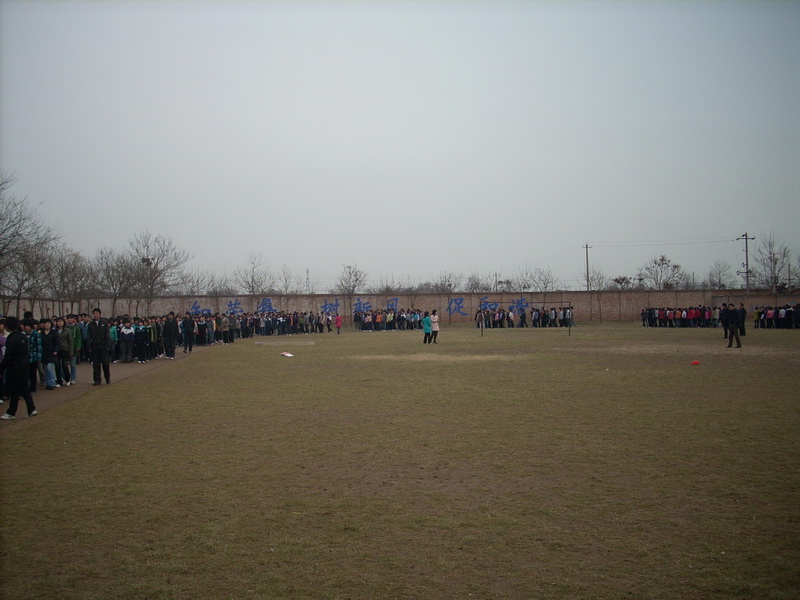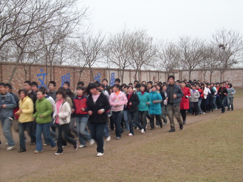 7点钟,开始跑步,各班级的体育委员站在队外带操。每个班级都有自己的早操口号,所以,除了喊一、二、三、四之外,能听到各种各样的振奋激昂的口号。每个班级不仅队列整齐,而且口号洪亮。