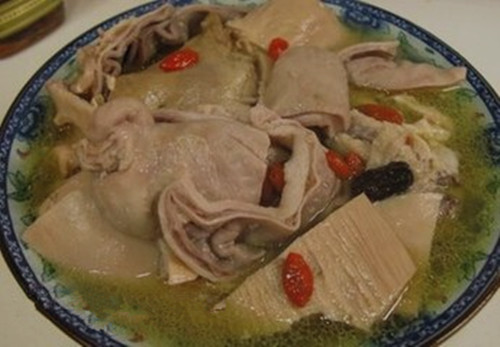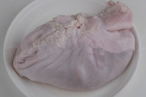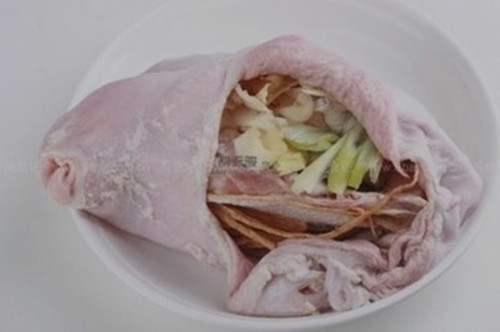 接着将猪肚(也就是猪的胃)在水龙头下发来复去的冲洗,同时用面粉和食盐反复揉搓猪肚后,用水冲洗,再用食盐揉搓水冲洗,如此几遍,直到无臭味为止。