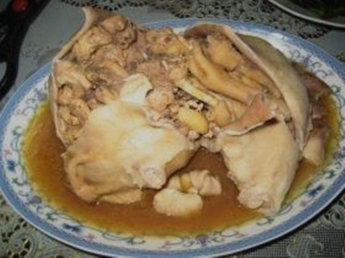 取出肚包鸡,用小刀肚子连同鸡肉割成无数的小块装盘,一盘香喷喷的肚包鸡就大功告成了。