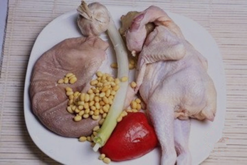 首先准备好必要的食材和佐料:一只猪肚、一只山鸡、刺萝卜、野参、山药、生姜、花椒、辣椒、食盐等。将宰杀好的山鸡去毛去内脏,用火燎好山鸡表面(主要是去除难以拔掉的绒毛;当然也是为了肉质更香)。