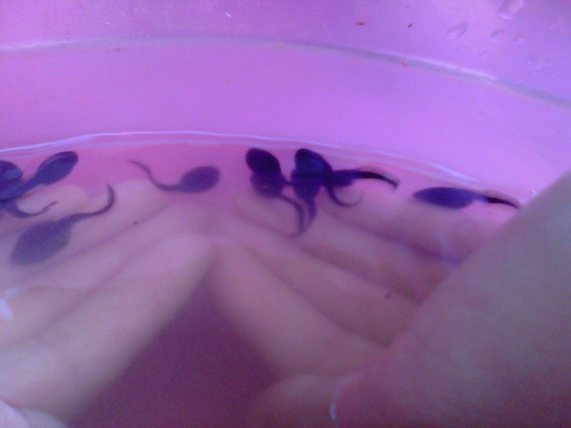 我想抓一只看个明白,我用右手轻轻地伸进水面,可是刚触到水就好像引起一片海底地震似的,蝌蚪们的感觉太灵敏了,还没等我接近它们,它们就快速的散开了,一看,我手周围早已不见蝌蚪的踪影。我便改变方法,拿了一个洗衣服的盆来舀,嘻嘻,小有成就,终于舀到几只了。几只蝌蚪仿佛知道自己中计似的,全都游到水面上了,沿盆缘游着。这一下,就是我大显身手的时候,我先把他们搅得一团糟,再伺机而动,我逮住它了!我小心捏着它的尾巴,正当我欣喜的时候它却逃了。哈!这下抓住了,因为上次的失败,我把它拿出了水面,手心的水一点点消失,黑黑的脑袋上有三个地方像鱼喝水一样的动着,其中两个小点还是对称的,我猜应该是眼睛吧,另一个就应该是嘴巴了。看完了便放到了水盆里。