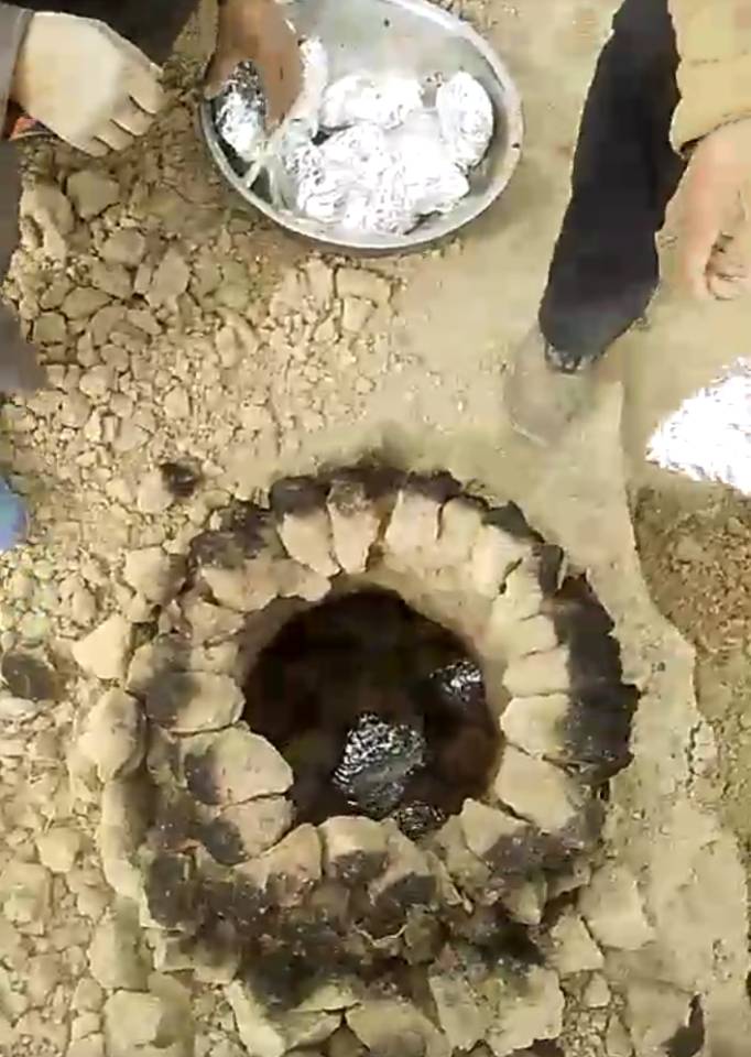 第六,放入食物之前,我们应该在土窑顶端开个小洞,然后将食物慢慢放入土窑中,将土窑砸塌,把食物埋起来,这样做是为了保温,让食物熟得更快一些。