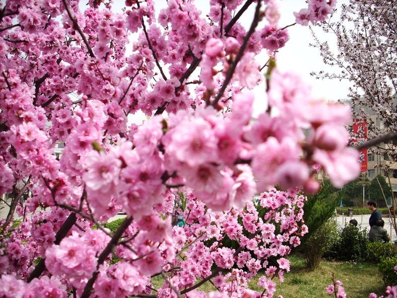 在迎舂广场上,在小草小树刚刚抽出嫩芽,众人的目光都被这美丽的鲜艳的红梅花吸引了来。勤劳的小蜜蜂闻到香味赶快飞来,迫不及待得停留在花上采起蜜来。