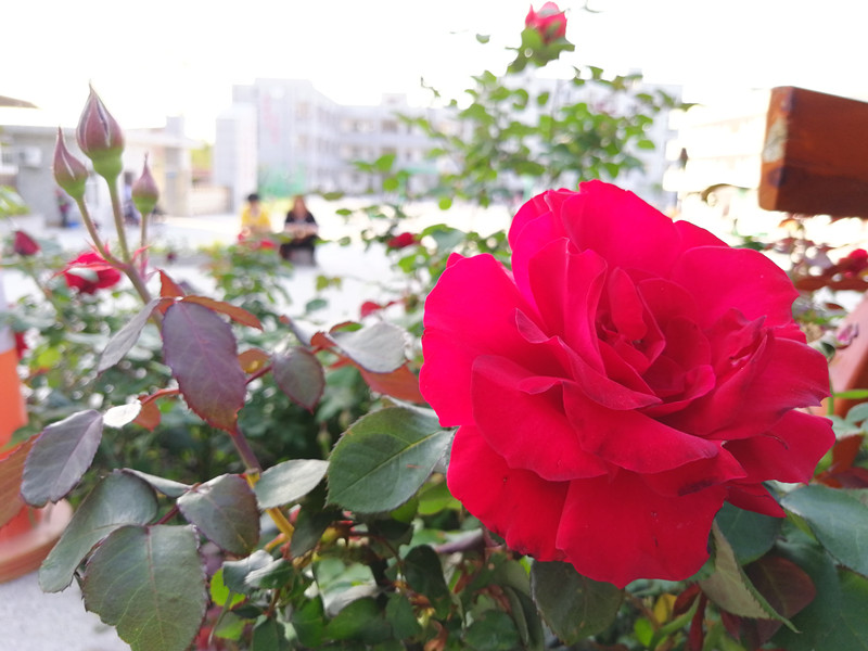 又红又绿的海棠树叶像一把把小扇子,像是给我们的校园送来了暖意,整整齐齐的灌木丛组成了一个长形的方队,仿佛很自信地说:"瞧!我们排列得多么整齐。"手推车里那一朵朵牡丹花,鲜艳的色彩,在阳光下展示着它的美。