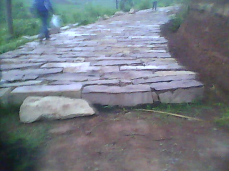 你现在可以看到我们的马路上到处是大块的石头,因此你可以知道我们要干什么了。所以政府出钱再加上老白姓每家每户的捐赠,他们出钱出力,在雨天,不怕风吹雨打,日夜不停的工作,在烈日下,他们不辞劳苦同烈日斗争,我们村的道路改善了。