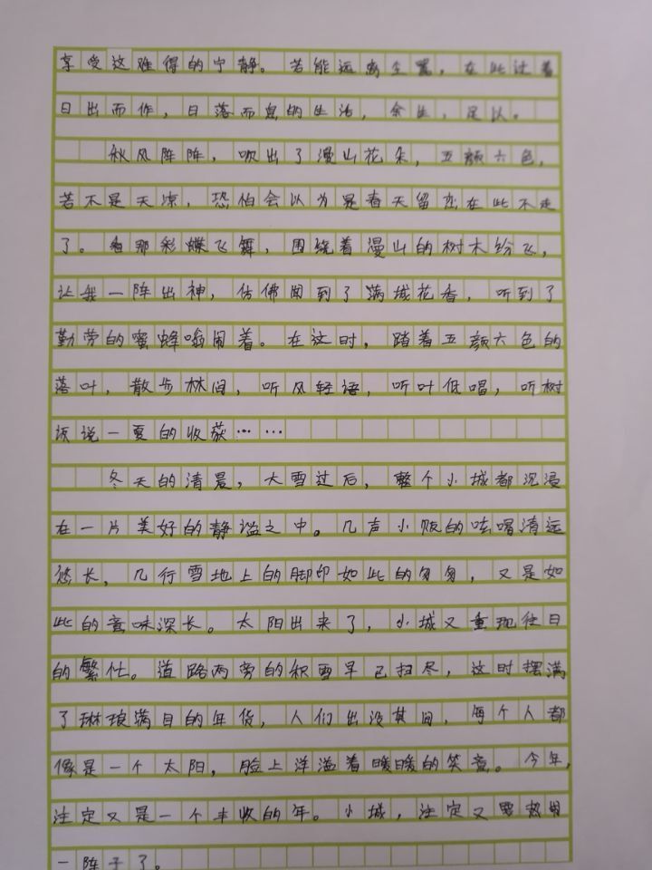 冬天的清晨,大雪过后,整个小城都沉浸一片美好的静谧之中,几声小贩吆喝清远悠长,几行雪地上的脚印如此的匆匆,又是如此的意味深长。太阳出来了,小城又重现往日的繁忙。道路两旁的积雪早已扫尽,这时摆满了琳琅满目的年货,人们出没其间,每一个都像是一个太阳,脸上洋溢暖暖的笑意。今年,注定又是一个丰收的年。小城,注定又要热闹一阵子了。