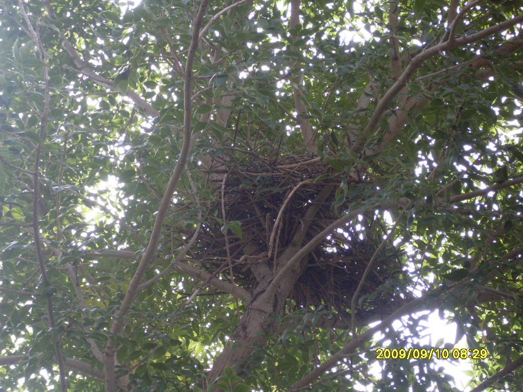 远处的这棵树上有一个鸟窝,这个窝是喜鹊窝。谁看了这个情景都会禁不住问起来:为什么这个喜鹊窝建的这么高?是呀!如果不是因为人类,喜鹊会躲得这么厉害吗?人类啊!请不要再让鸟儿这么提心吊胆了,好吗?