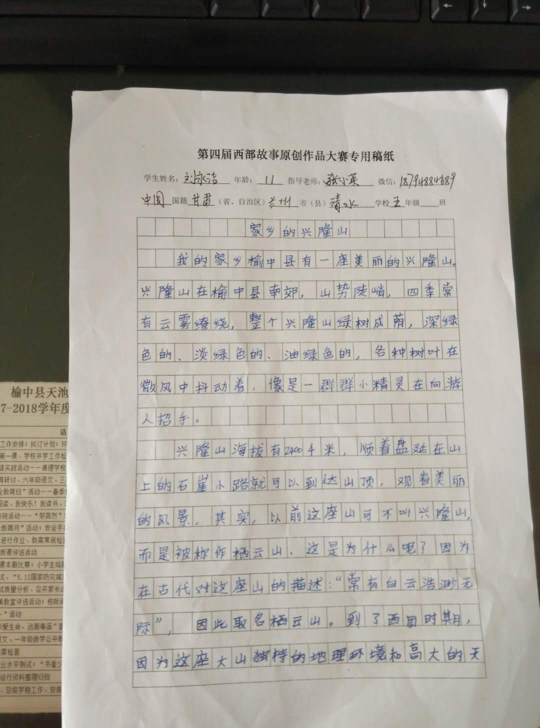 我的家乡榆中县有一座美丽的兴隆山。兴隆山在榆中县南郊,山势陡峭,四季常有云雾缭绕,整个兴隆山绿树成荫,深绿色的、淡绿色的、油绿色的,各种树叶在微风中抖动着,像是一群群小精灵在向游人招手。