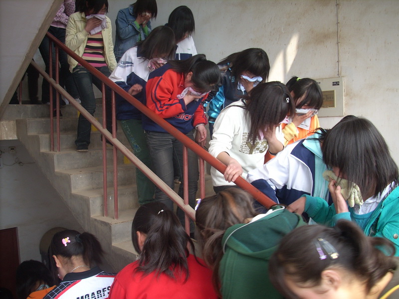 当204出现火情后,由舍长立即向总指挥田主任报告,田主任向全体女生发出撤离的命令,同时,各老师也迅速到达指定位置,负责学生的撤离,撤离时,按照要求,先是出现火情的那一层同学撤离,然后是上层同学,其次是最下层同学,同学们下楼时,都用湿毛巾捂住口鼻,弯着腰,两排分开有序撤离,下楼后,分别从两侧跑到指定的安全位置。