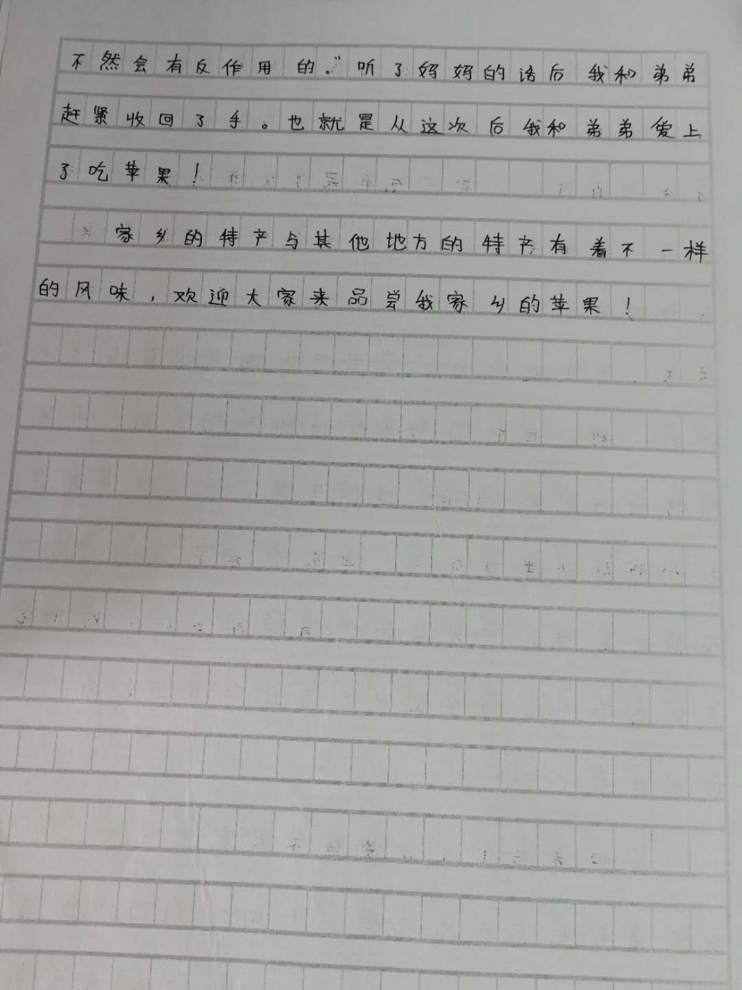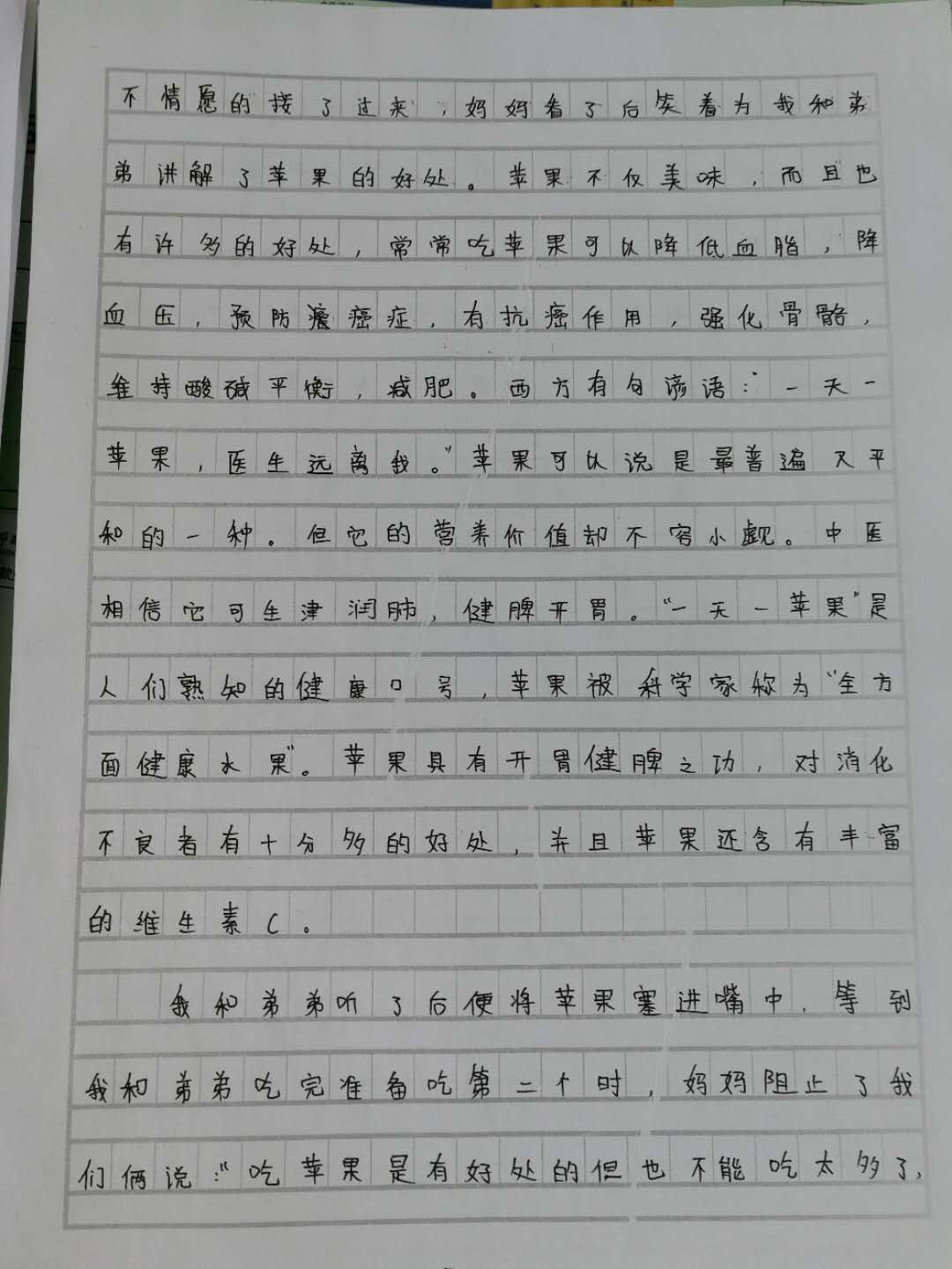 我和弟弟听了后便将苹果塞进嘴中,等到我和弟弟吃完准备吃第二个时,妈妈阻止了我们两说:"吃苹果是有好处但也不能吃太多了,不然会有反作用的。"听了妈妈的话后我和弟弟赶紧收回了手。也就是自从这次后我和弟弟爱上了吃苹果!