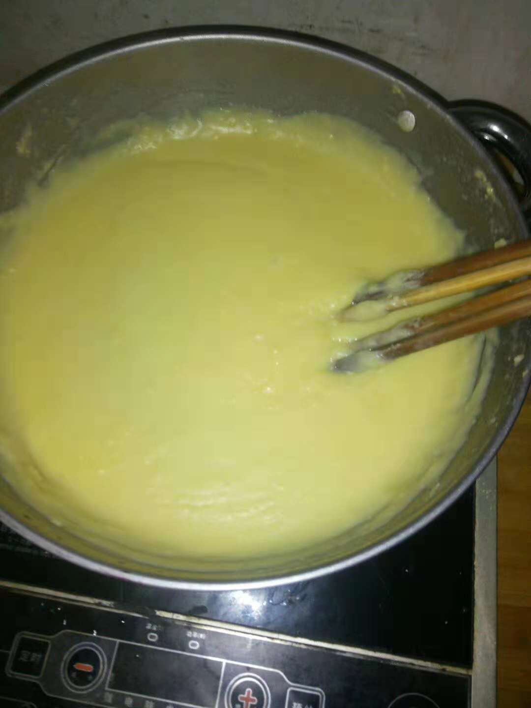 下面让我来告诉大家教团这道美食到底是怎么做的呢?首先我们要在锅里边烧开水。用大火烧开,如果有小米的话就先将小米煮在锅里把它变成小米粥,接下来我们要用面粉均匀的搅拌在滚开水或者小米粥中,左手抓来玉米面,一边向锅中慢慢的撒去,右手拿一根棍子在锅里用力的搅。我们要顺着一个方向搅,而且要不停的搅,不然面就会起小疙瘩。玉米面撒完以后,我们用小火慢慢的煮,边煮边用棍子继续搅拌。几分钟以后搅团就熟啦。