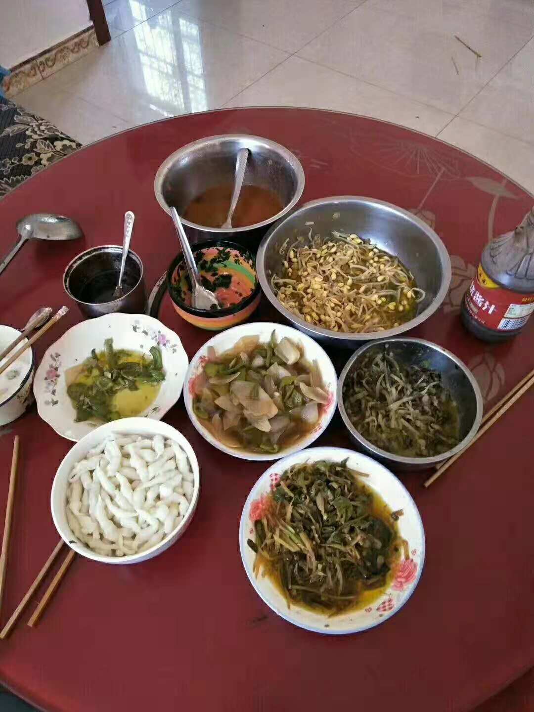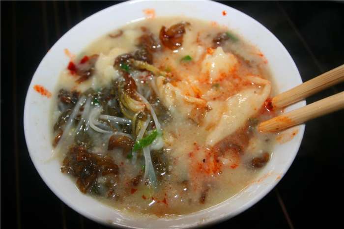 搅团做好以后我们还要再烧一锅酸菜汤和浆水,这样就可以吃了。我们先将搅团盛到碗里,在倒上我们调好的汤汁和酸菜,最后再加一勺油泼辣子。好啦,最终的美食已经可以开吃啦。味道真是好极了。