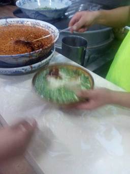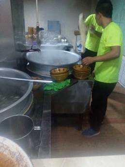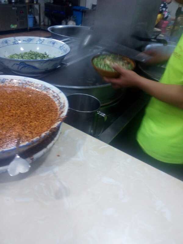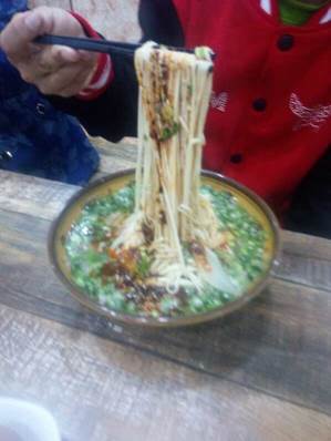 看完后,被“啪啪”声吸引了,原来师傅在厨房拉面,我们做的这个位置,正好把厨房看的清清楚楚。只见师傅拿出事先揉好的面团,用手将面团拉长,等到了一米的时候,把面条对折,两头揉合,“啪啪”两声面条又细了些,多了些,师傅反复这么做,把面团变成了许多细长细长的面条。师傅将面条放入大锅中,没一会儿面条就熟了。捞出来后,放在出饭口上,浇上汤料,撒上牛肉丁与香菜,浇上辣椒油。这真是人们形容牛肉面的场景“一清二白三红四绿五黄”。