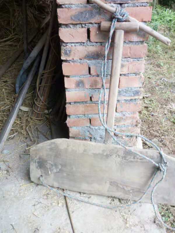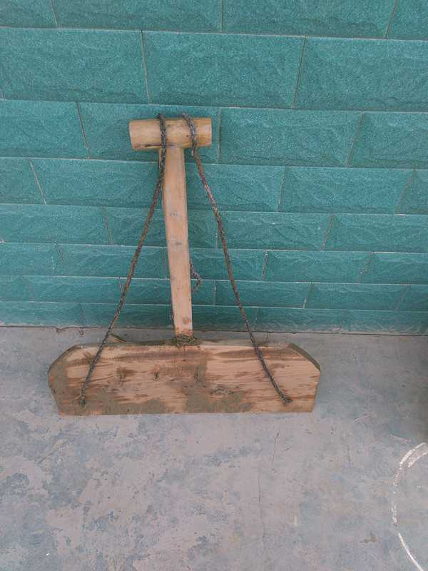 我家有一个扯盘子,它是农家人必不可少的劳动工具。 做扯盘子之前得准备一根70厘米长的圆木头、一根150厘米长的圆木头、长的圆木头另一端要弄成扁状二以、一个140厘米长,厚薄适当的长方形木板、木板左右两边各弄一个小圆孔、两根长短一样的绳子、一根80厘米长的小竹杆。