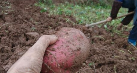 我们每人拿起一把小铲,来到地里,我不管三七二十一,先把红苕藤拔掉再说。然后,使劲将铁铲插入泥土里,再用力把泥土里的红苕往外掘。或许是用力太大,或许是插错了位置,那可怜的红苕被挖出来时已经断成两截,我气得直挠头。随后,我又发现了一个露在外面的红苕藤,这次有了经验,我就小心翼翼把铁铲插进去,先挖掉一层土,露出了一小块红苕,然后再用铲子在周围挖,终于把它挖出来了。我一得意又想再挖一个,就又一把插进去,用尽力气猛的一下向上掀,红苕就像土行孙从土里飞了出来,我拿铲子接住了飞起来的红苕,把我的劳动成果递给了爸爸。