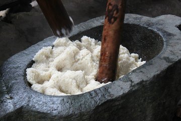 中秋节的头一天,家家户户都会浸泡糯米,第二天人们一早就起床,将糯米淘干净后,先将纱布平铺在事先准备好的蒸笼里,再把淘好的糯米倒入蒸笼里,盖好盖子,然后用火把糯米蒸熟,最后再把蒸熟的糯米放进洗干净的石窝里。