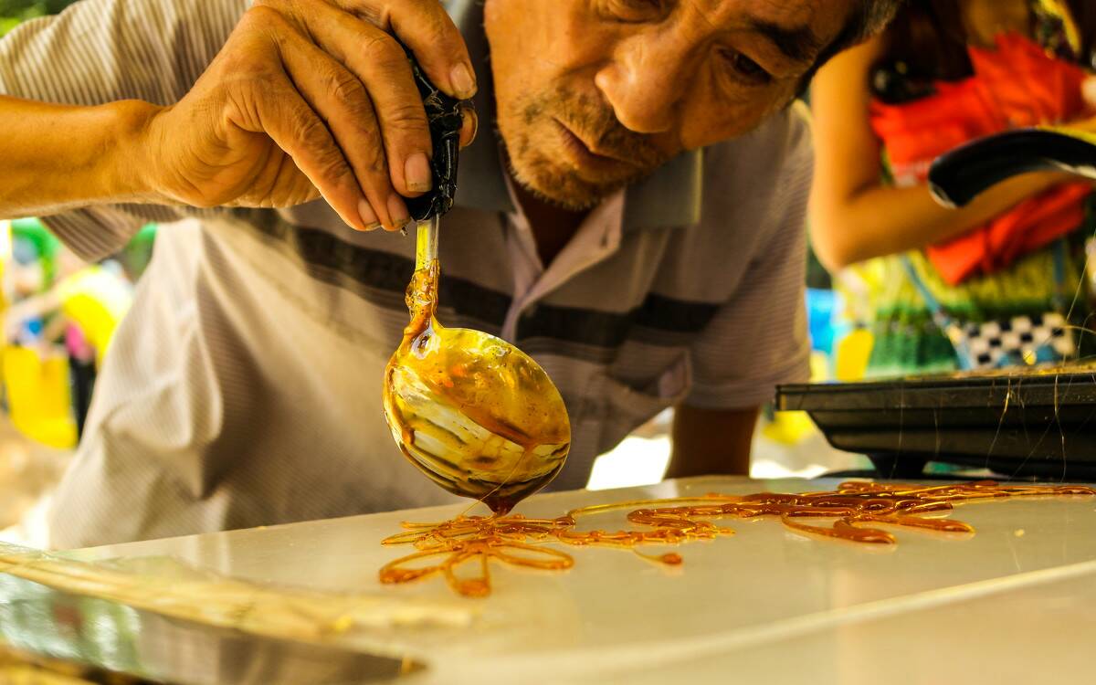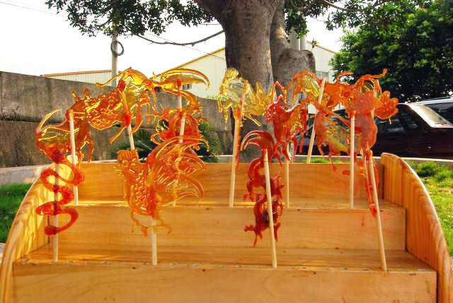 吹出来的糖人是不透明的,像和好的面粉一样,有白的、红的等几种颜色。装糖的盘子下面有个电炉,是用来加热糖块的,融化的糖稀随着电炉升温而沸腾起来,变成一团团大地色的糖球,像蜂巢里刚淌出来的蜜一样,只见手艺人用一撮麦芽糖那么一吹、一拉、一扯、一捏、一个个栩栩如生的十二生肖就完成了。