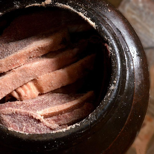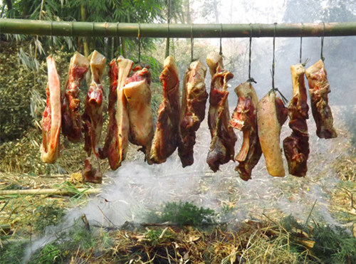 首先,准备好一口大缸,把一块块猪肉均匀地撒上粗盐放进缸里,大约腌制两个星期后,再把腌好的肉取出来(这时盐已融化并渗进肉里面),用温热水洗净猪肉表面的盐和血水。沥干水分之后,将肉挂起来用柏树枝烟熏,直到肉被熏得金黄为止,再把香喷喷的腊肉放在太阳底下晾干水分。那一排排的鲜香的腊肉,它似乎在向客人展示着主人今年的收成。听着客人的称赞,主人的脸上露出笑意,心里甜滋滋的。客人临走时,主人家也会送上几条腊肉作为馈赠的礼品。