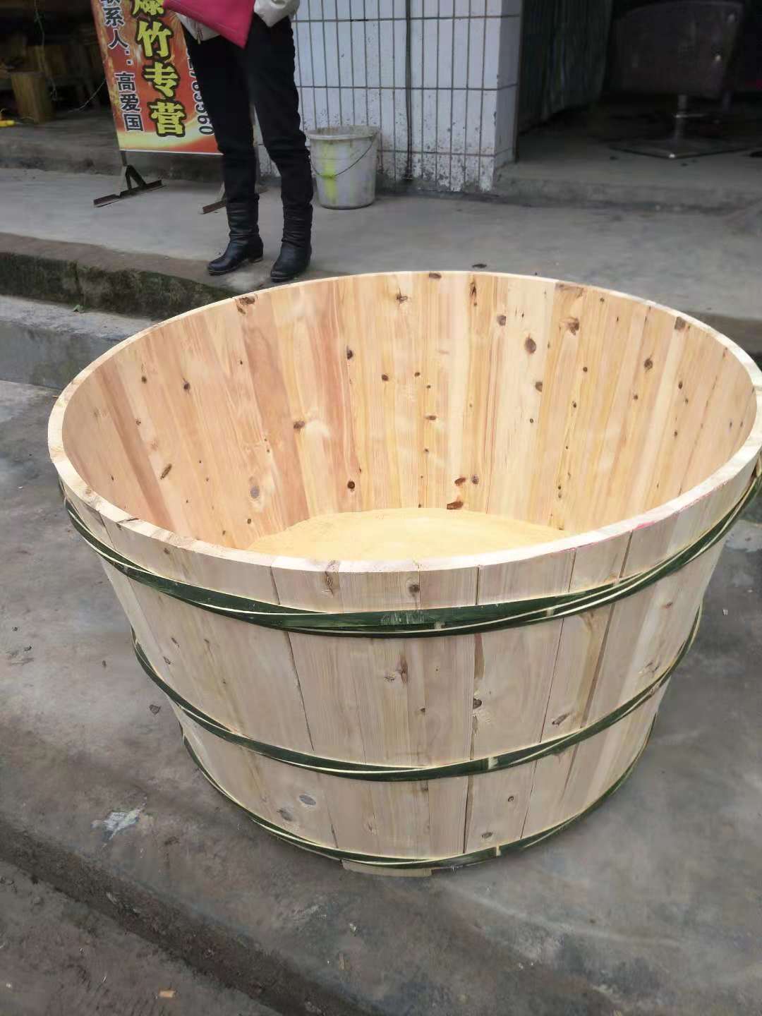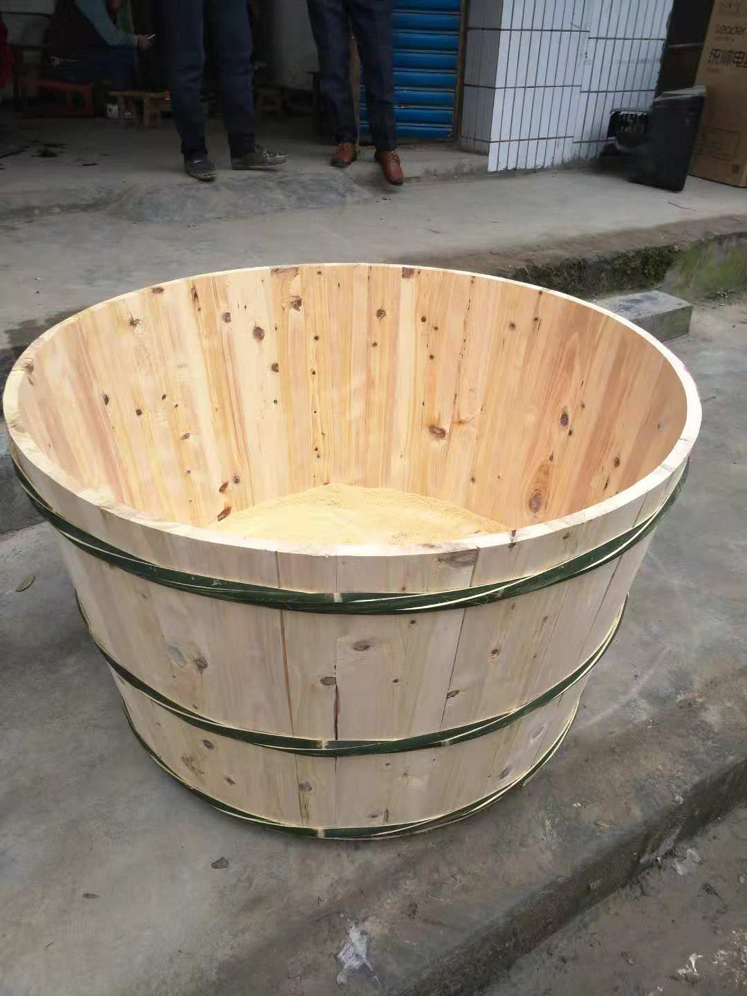 我家的黄桶都用了好几年了,黄桶的制作过程极其复杂。它是用柏树木板做成的。先用斧头把柏树的皮刮去,用改木板的机器再依次把它弄成大小均匀的木板。宽约1米,长在2米与1米之间。还要把两边用锯子切出一些,这样就要平整一些。之后把竹子划成一根一根的,还要把它削成10厘米的竹根,再把两边削尖来,把板子的两侧用电锯扎几个小孔,每张木板上的孔要对齐。用削好的竹棍插进板子的小孔里,用橡胶锤轻轻的把上下木板敲拢,每一块都照着这样的方式来。把所有木板围成一个大圆圈:大的黄桶木板要多些,小的黄桶木板要少一止上。还要用竹块围着黄桶外绕几圈,用绳子把竹块系紧,黄桶上端绕一个大圈,中间再绕两圈。现在开始做黄桶的底,底部要根据这个大圈来制作,底也是用这些木板制作的,中间用两个较长的木板,两个木板旁边的木板要稍短一些,最后两边是最短的,而且是半圆的。用电锯给每一边扎一个小窟窿,再把竹条插进去,用橡胶锤轻轻敲几下发好了。把底从大圆圈上装下去,再用橡胶锤敲平整来。再在底的外面用竹块绕上一圈。这样黄桶就做成功了。