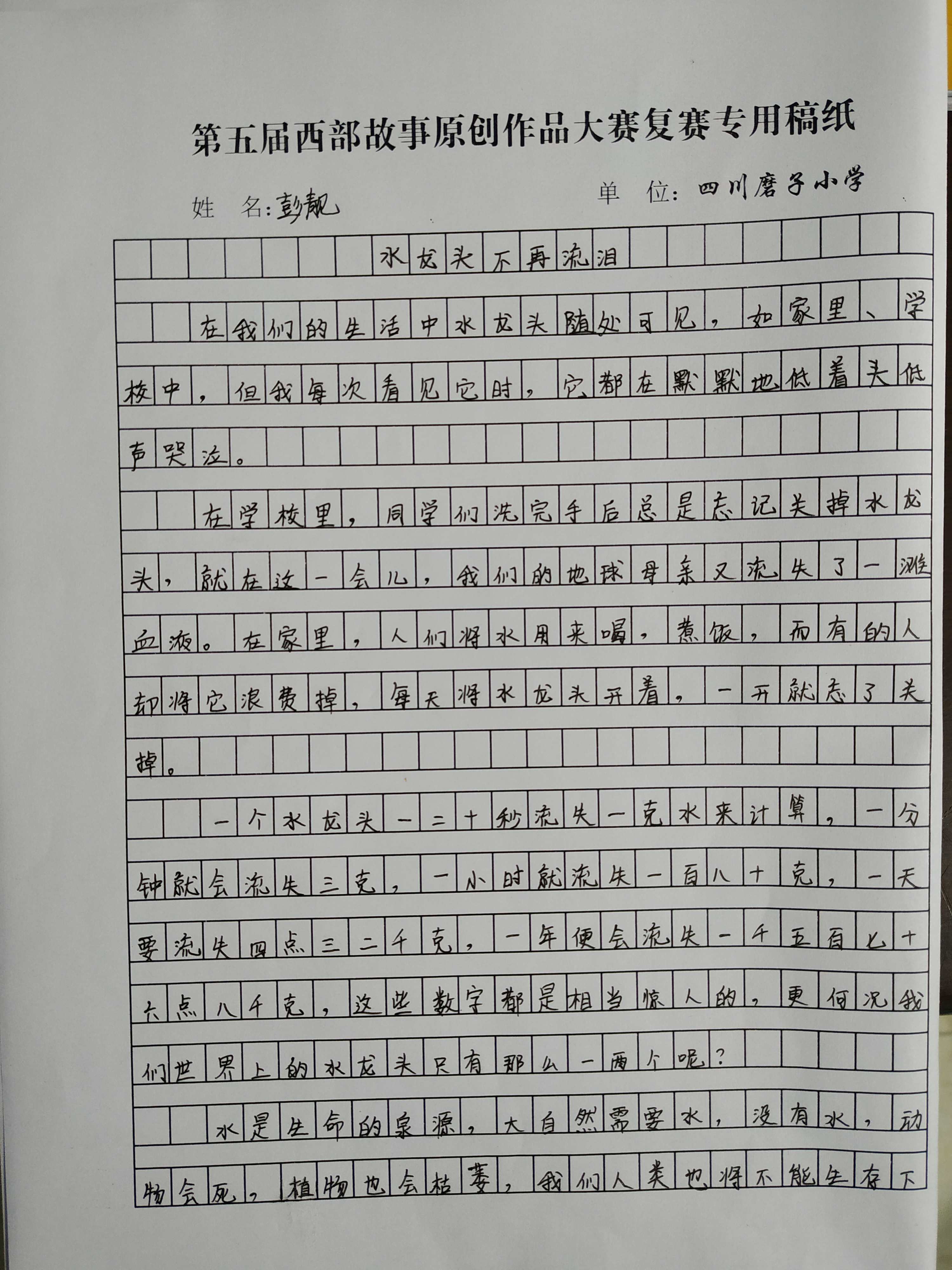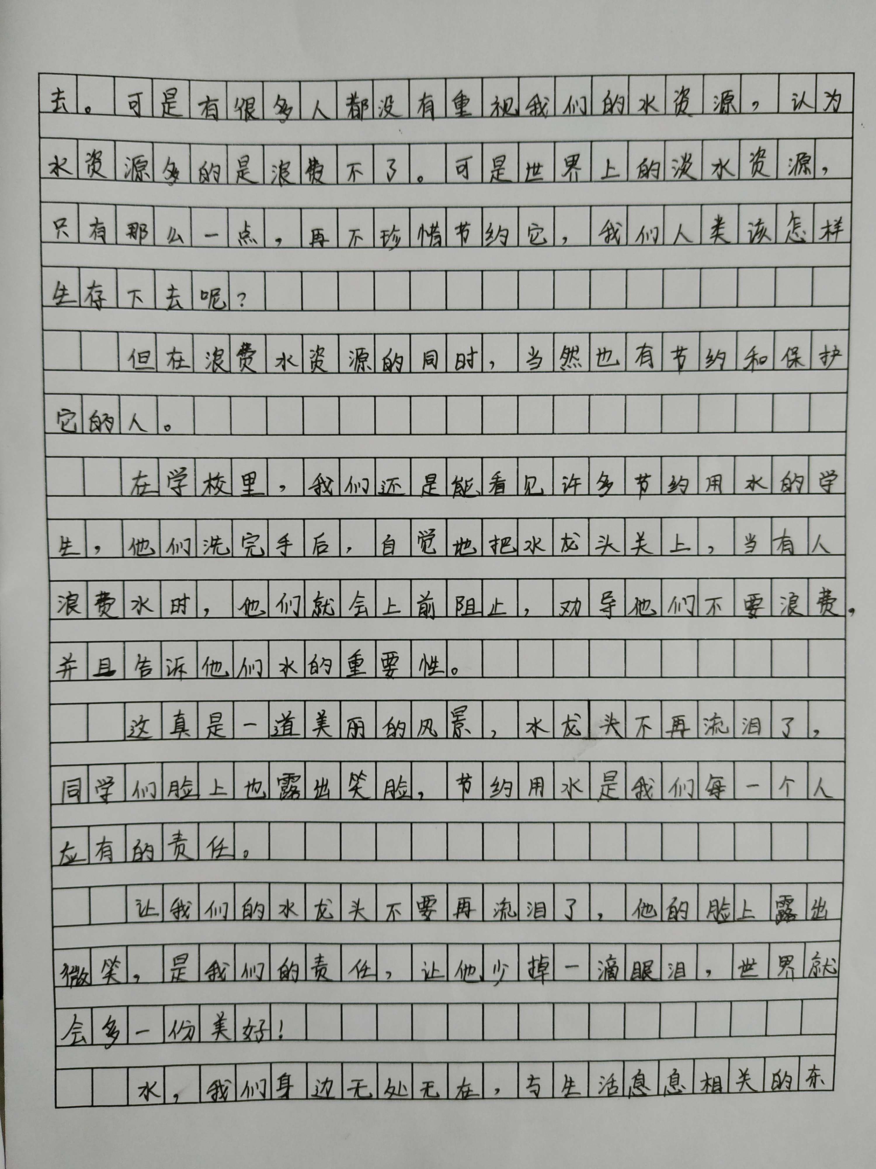 在学校里,同学们洗手后总是忘记关掉水龙头,就在这一会儿,我们的地球母亲真又流失了一滩血液。在家里,人们将水用来喝,煮饭,而有的人却将它浪费掉,每天将水龙头开着,一开就忘了关。