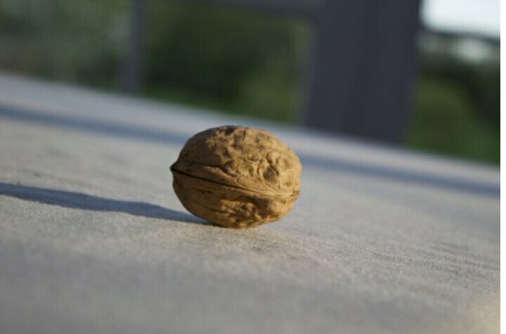 我的牙齿看来不这么好,所以不敢咬,而且这一些野核桃不管我这么咬都咬不动它。于是,我改用武力解决。我拿来了一把榔头,又拿来一块厚实的木板。然后,我左手拿起野核桃放在木板上面,右手高高举起榔头,用力往下一敲。"啪"的一声,野核桃被我砸碎了。
