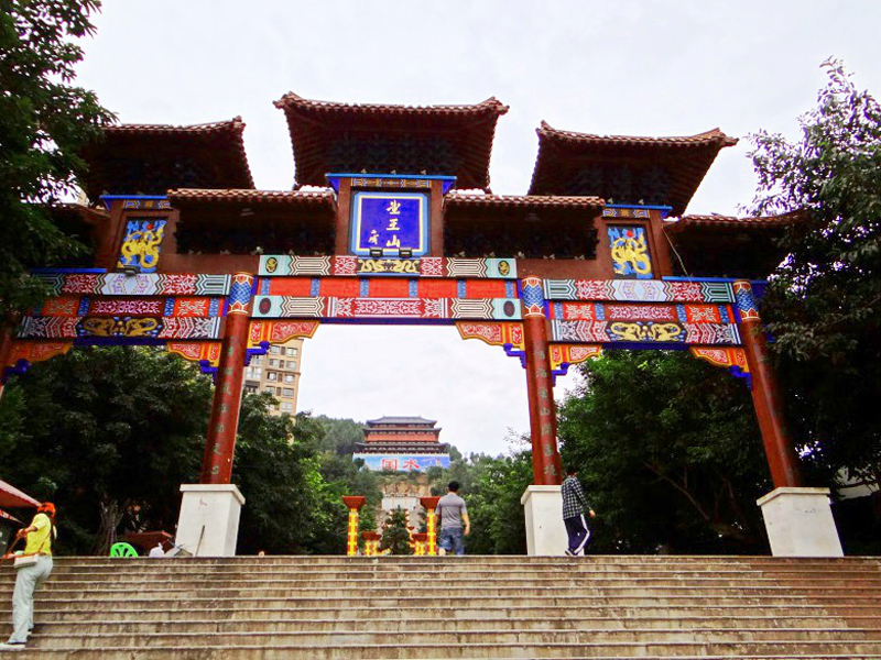 到了望王山脚下,映入眼帘的是那高11.2米的仿古山门。在山门上方有几副双龙戏珠的图案,上面的顶楼、边楼、夹楼分别用四根钢筋混泥土柱子所支撑,中间"望王山"三个金色大字灼灼闪光。花岗石铺成的上山梯步一直伸向山顶,旁边种着撑着蓝天的大榕树。