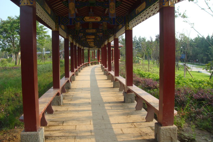 继续往前,又望见了长长的走廊,同样是仿古的长廊,每隔几米就会出现一对柱子,柱子上面的匾额上画着古人运动的图案,而且每一幅都各不相同。最后,我们来到了登高楼,居高临下,巴城尽收眼底,下面的汽车如甲虫,房屋如火柴盒,远处的大山连绵起伏,近处的巴河绿如绸带,美不胜收。