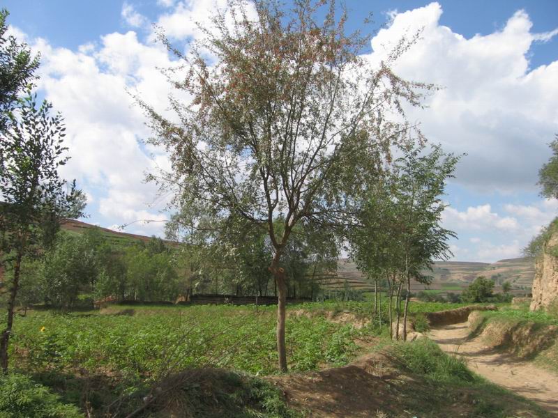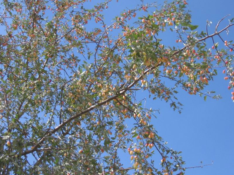 它的果实像葡萄一样也是圆的,但比葡萄小,比我们这里的豌豆大。到七八月就成熟了,酸里带甜的小果子挂满了枝头。整个一片面梨树就像朝霞光辉四射。这时孩子会围在树下争着摘面梨。
