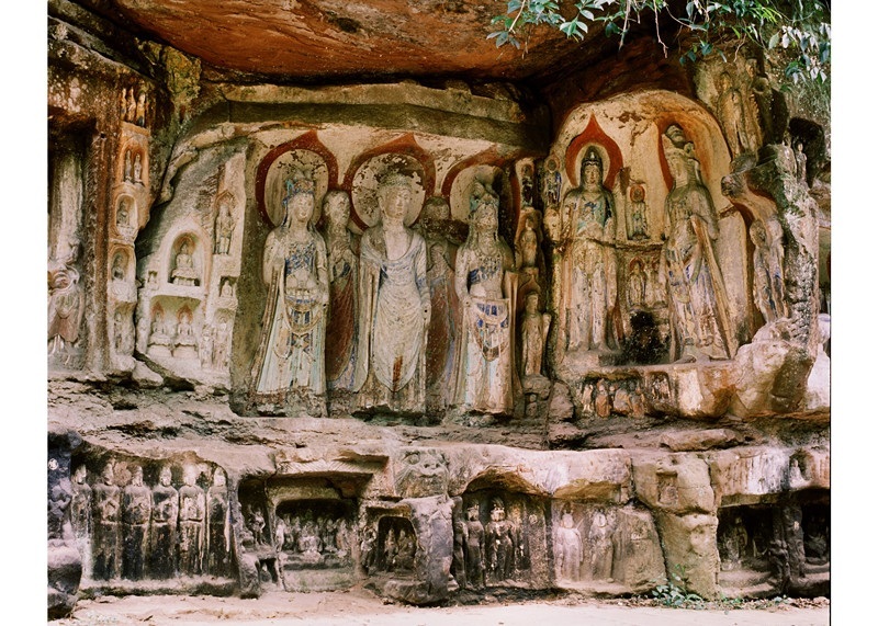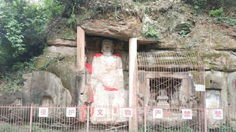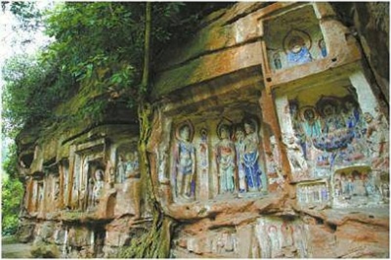 飞仙阁摩崖造像位于我家乡的蒲江县朝阳湖镇仙阁村,是“蒲江石窟”的重要组成部分。石窟位于青山绿水间,悬崖峭壁上。飞仙阁摩崖造像以唐代为主,形态各异。我在飞仙阁一边看着雕像,一边发出赞叹:“啊!这些凝聚了先人的血汗的杰作真的太壮观了!”我之所以这么说,不单单只是因为雕像壮观,而是因为它居然还在我的家乡里,真是不可思议。