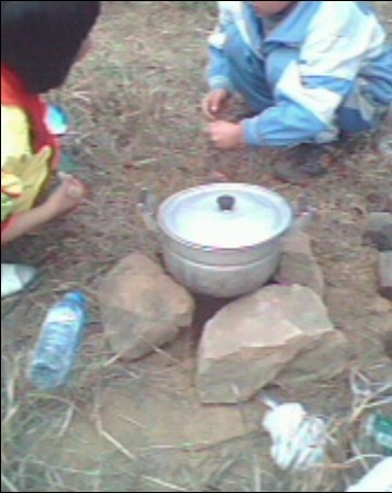 终于到达目的地了,大家已选好地方就开始忙活起来:男同学忙着搬水,女同学有的除草,有的除草,还有的准备材料。每个小组都忙得不可开交!