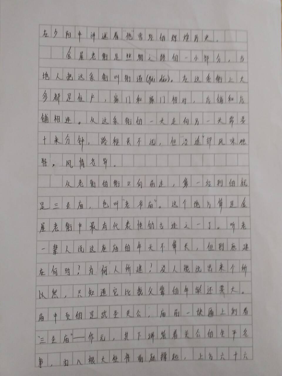 从老街的街口向前走,第一站到的就是三圣庙,也叫老爷庙。这个地方算是金崖老街中最有代表性的古迹之一了。听老一辈人说这座庙的年头不算长,但到底建在何时?为何人所建?没人能说出来个所以然,只知道他比我父辈的年龄还要大。庙中供的是武圣关公,庙前一块匾上刻着〝三圣庙〞﹎作元,其下端绘着关公生平名事,有八根大柱将前庭撑起,上方六十六根椽子相连构成三圣庙框架……或许是他的沧桑与独特的结构才会让他扬名老街,扬名古镇吧!