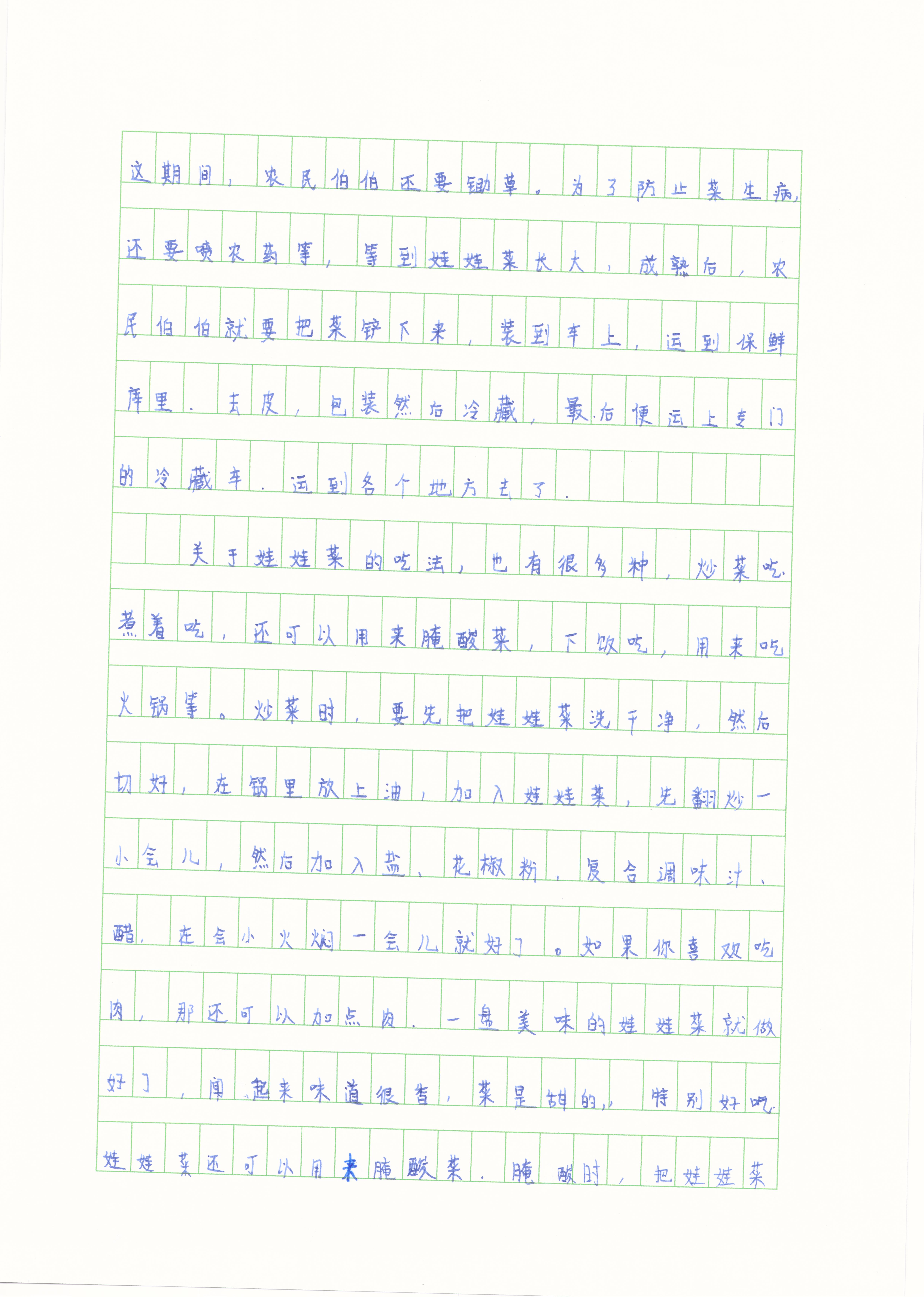 在这边,娃娃菜一般都在四月上旬,中旬开始种,到七八月份开始往外买。种菜的过程是很幸苦的,农民伯伯要先在地里施肥,然后在地里铺上地膜,开始种种子,然后要浇水,等到种子发芽了之后,要在施一次肥,在这期间,农民伯伯还要锄草,为了防止菜生病,还要喷洒农药等。等到娃娃菜成熟后,农民伯伯就要把菜铲下来,装到车上,运到保鲜库里,去皮,包装,然后冷藏,最后便运上专门的冷藏车,运到各个地方去了。