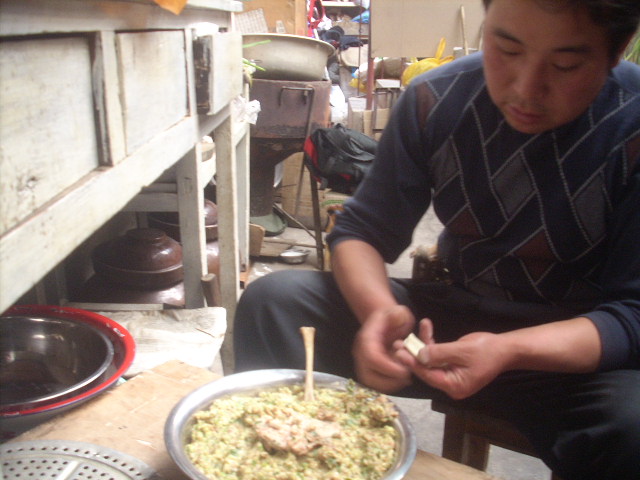 家乡的饺子馅是用家乡独特的腌制方法做的,与瘦肉做成的。要把肉炒的半熟,再切好的酸菜沫放进去拌匀;又去擀面皮,做成圆形的,面皮薄厚适中。最后在面皮上放适中的饺子馅,捏成各种形状的饺子,然后下锅。
