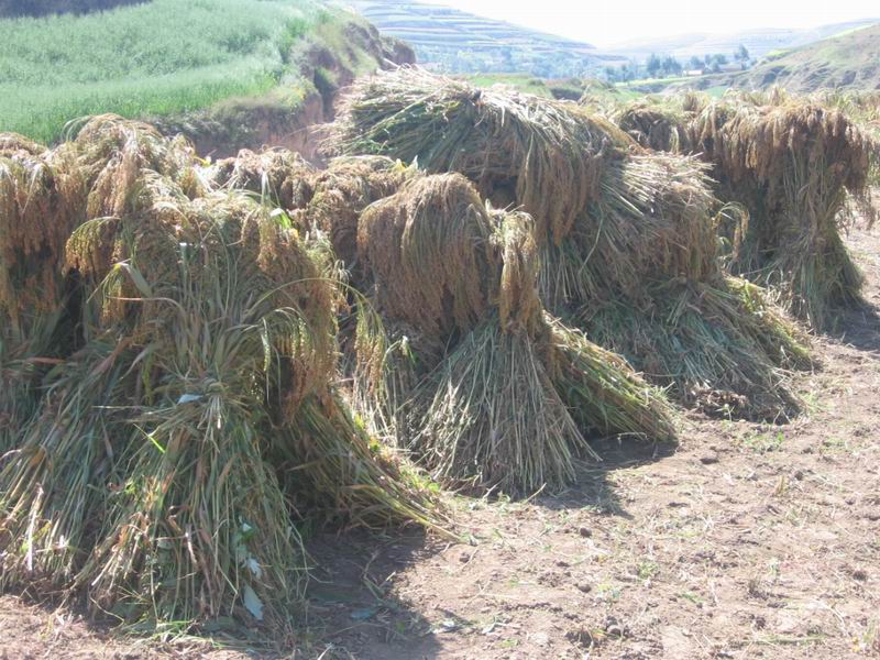 它还是人们的经济来源之一,今年,它的价格很高。人们总是乐呵呵地把收割的糜子堆成跺,等待糜子很快地干燥。