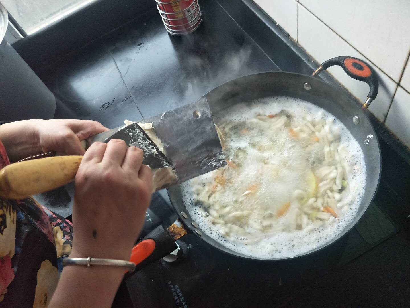 最后锅中放入我们每家都必备的肉臊子,还有些许盐,花椒,胡椒粉,味精,搅拌均匀,香喷喷的抄疙瘩出锅了!这些步骤,虽然简单,但是也传承了西北人民对面食的喜爱。
