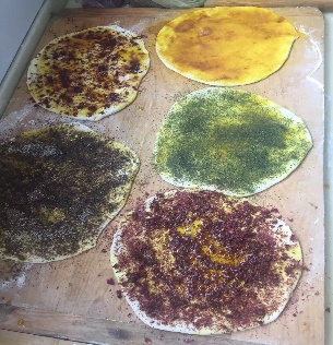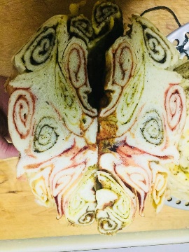 月饼的制作过程并不简单,今年中秋节前,我的妈妈就开始取发面。所谓发面就是上一次做馍馍专门留下来的发酵好的面团,起着酵母的作用。用温水把发面泡软,然后开始用九十度的水和面,水要一点一点的加到面粉里,和成絮状后把它们都揉到一起,放入发面,接下来就是等面发酵,这个过程叫做醒面。等发酵够一夜后,妈妈才开始揉面和放碱,揉面只需要力气和耐心,但放碱就难了,放碱是为了中和发面的酸性,还能让月饼更有韧性。我做了妈妈的小帮手,帮妈妈一起把碱和面揉匀,这时还要烧一个“灰蛋”,灰蛋可不是蛋,而是把一小块面团在火上烧熟,如果剥开它后颜色发青则是放的碱太少,必须要像蛋黄色才可以。碱和面的比例很难掌握,要反复地烧灰蛋检验并调整直到合适为止。再把揉好的面团擀成五个薄薄的圆形面饼后,妈妈拿出外婆亲手用玫瑰花制作的玫瑰酱,还有姜黄、苦豆、黑油、红曲。把这五种颜色不同的馅料和菜籽油,依次均匀地抹在五个面饼上,叠在一起,卷成一团,最后在上面包上一层没有涂馅料的面饼,上锅用大火蒸一个小时左右。出锅后,月饼的制作终于完成了。
