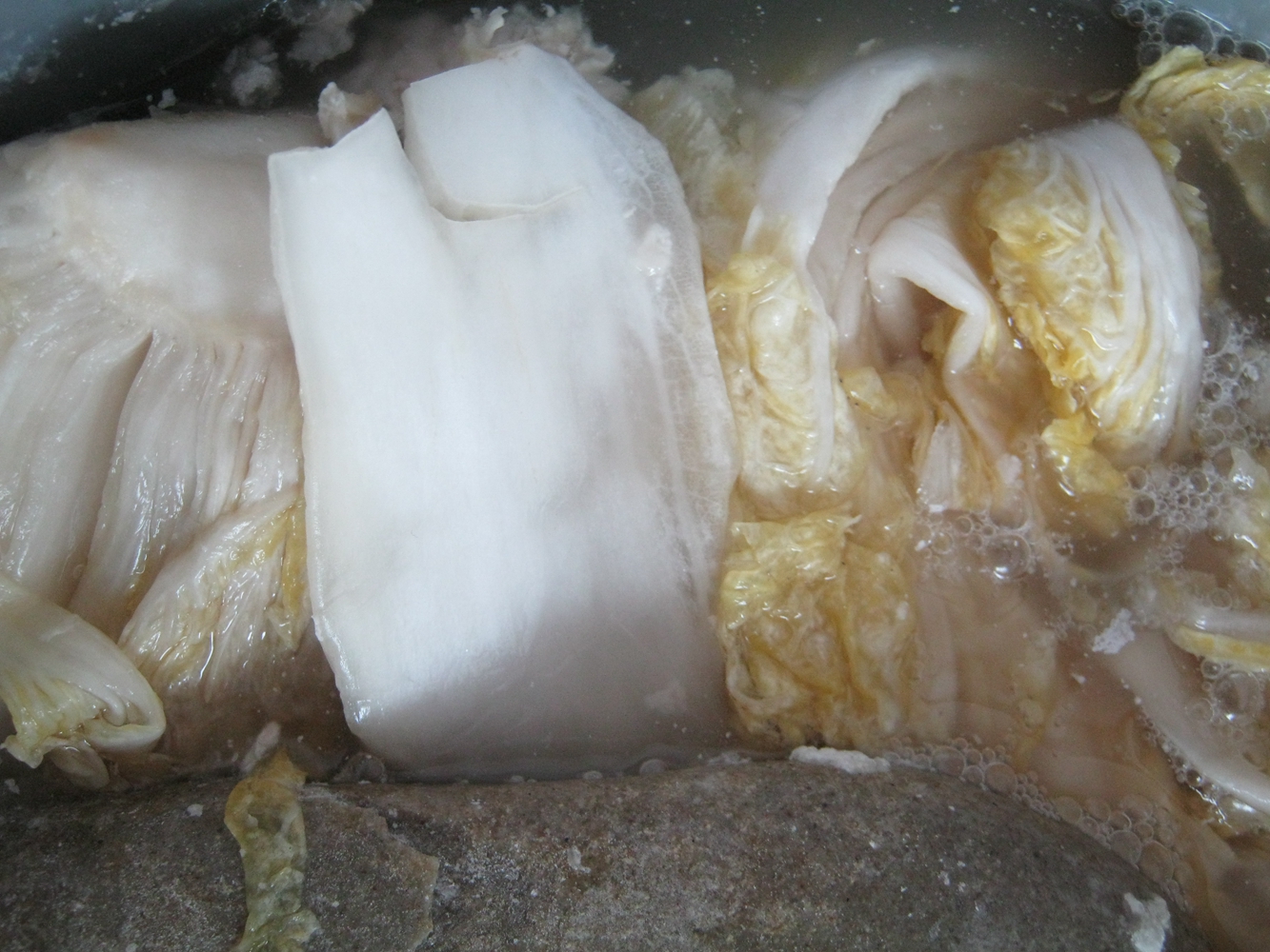 然后找一个大大的毯子,再找一个大大的石头,把它们也洗干净,然后再把开水倒进去,第三部就是放菜了,首先准备一袋子盐,放一层白菜,放一把盐,医生医生放上去,每一层都要撒盐,坛子装满以后把准备好的石头压在菜的上面,压石头是因为可以把味道融进菜里面去。
