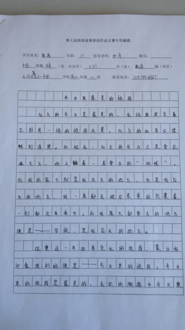 北方的冬日是最美的,在校园里会看见别具一格的校园风景。北方的四季分的特别清楚,而现在北方的冬日已是雪花满天飞,地上铺着一层雪白的"地毯"。而我的家乡就是我出生的地方,也是我成长的地方,我一直都在被它紧紧的包裹着,一刻都没有离开。而我每天都要去的地方便是——学校,是我成长的地方。观察过一年四季变化的校园,最让我印象深刻的便是——冬日里的校园。冬日里的校园是最美的。在你的脑海中冬日里的校园会是什么样子呢?在太阳高高挂在天空中的时候,操场上会有着运动,打篮球和打羽毛球等的同学。太阳公公在对他们微笑,偶尔还会有关系很好的女生们拉着手一起晒太阳。而在下雪的时候抬头望着天空中纷纷扬扬的雪花满天飞扬,心中莫名有一种兴奋感。尤其是在上课的时候,看着窗外飘着雪花,班里大多数同学都已经坐不住了,等待着下课去玩雪。过不了多久,或许也是到了下课的时候,把原来的校园变成了雪白的一片,地面变成了雪白的"地毯"。校园操场的雪地上感觉极其老,所有的学生一样,每个人脸上都洋溢着灿烂的笑容,还有欢快的笑声。制造出了一片沸腾的景象。冬日里的校园是最美的。看着操场上同学们灿烂的笑容,心里美美的。也总有几个调皮的学生把雪揉成小球,玩打雪仗,虽然觉得他们调皮,但是我还是加入了他们,开启了我们的打雪仗战争。揉小雪球把两只手冻得通红,但是笑的非常开心,是真正的美,心里美滋滋。